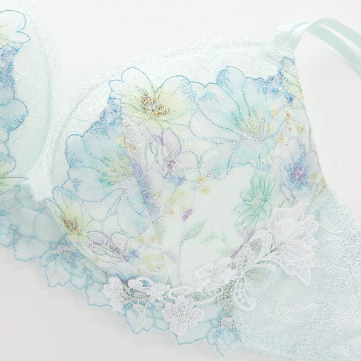 春の訪れを感じるような華やかで彩りのあるプリントと、ラメ糸のチュールエンブロイダリーレースが美しいデザイン。アンダー部分には草花モチーフのケミカルアップリケに花を描いたチュールエンブロイダリーアップリケの立体加工がされ、特別感のあるデザインに仕上げました。