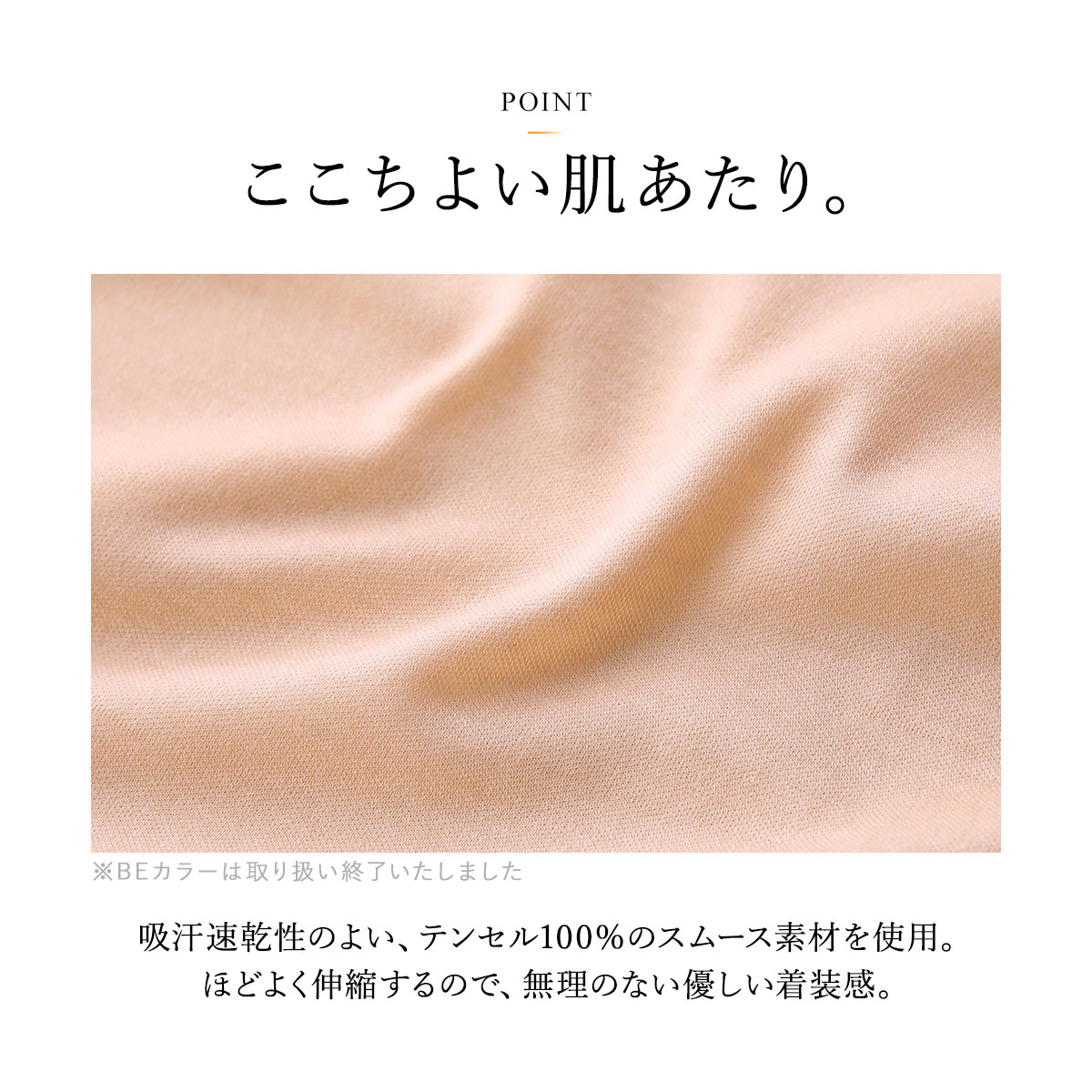 身生地には吸汗速乾性のよい、テンセル100%のスムース素材を使用。なめらかでここちよい肌あたりです。ほどよく伸縮するので、無理のない優しい着装感。ストラップの長さはバックアジャスターで調節可能です。