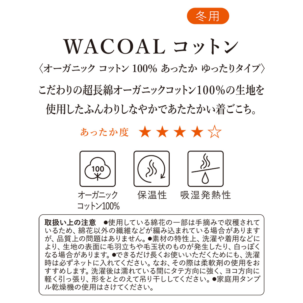 こだわりの超長綿オーガニックコットン100%の生地を使用したインナー【WACOALコットン オーガニックコットン100% あったか ゆったりタイプ】。ふんわりしなやかであたたかい着ごこちです。