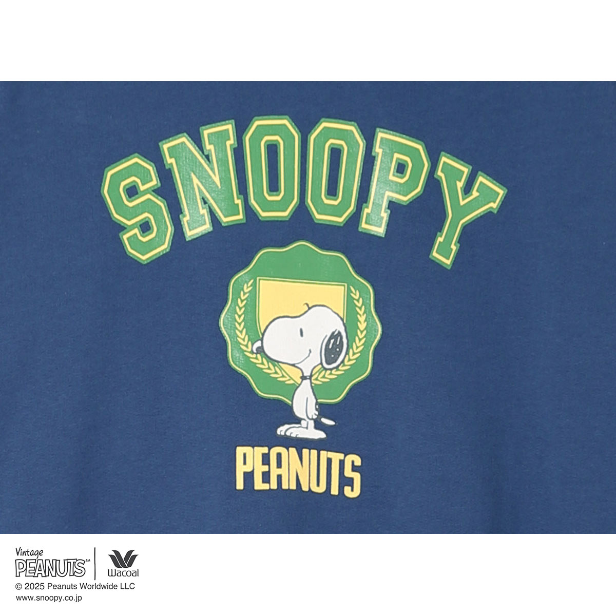 前身頃のロゴとスヌーピーを組み合わせたアメリカンカレッジ風のハンドプリントがデザインポイント。
