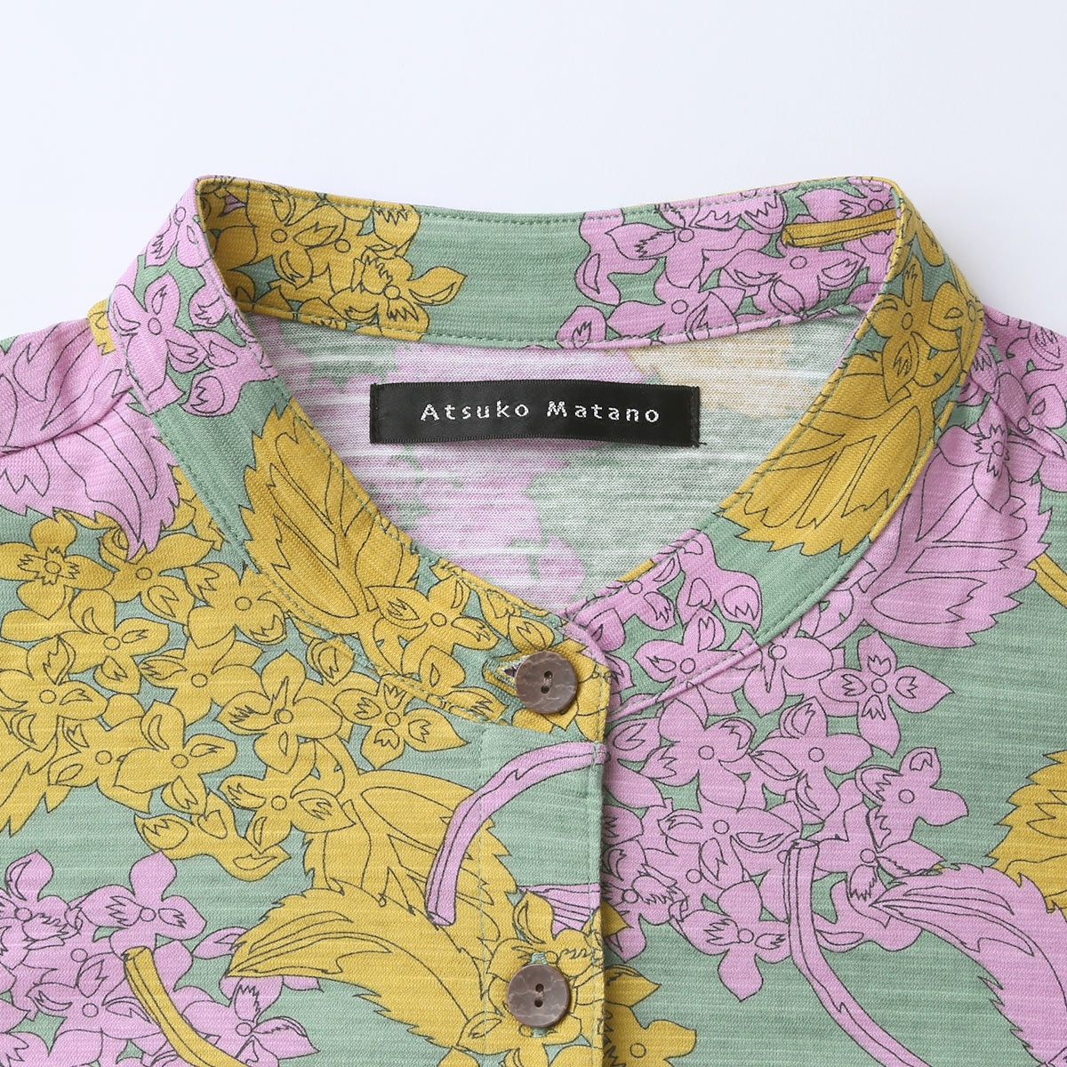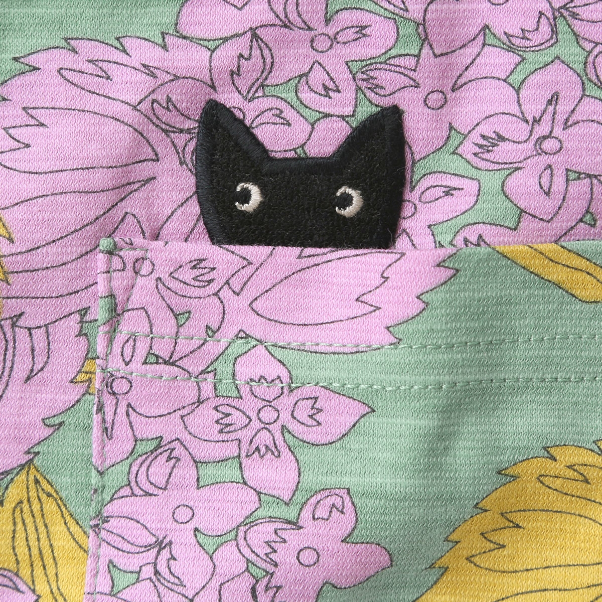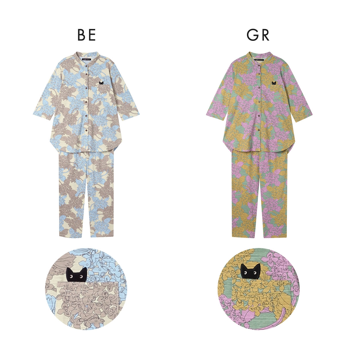エレガントで控えめな華やかさの紫陽花柄です。胸ポケットから顔をのぞかせている黒猫のアップリケがデザインポイント♪