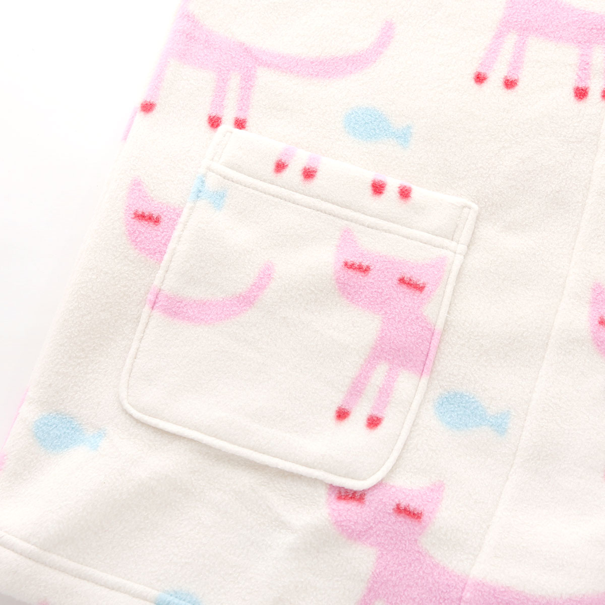 まつ毛がポイントの猫と魚が愛らしいテキスタイル♪ポケットから顔をのぞかせている黒猫のアップリケがデザインポイントです。