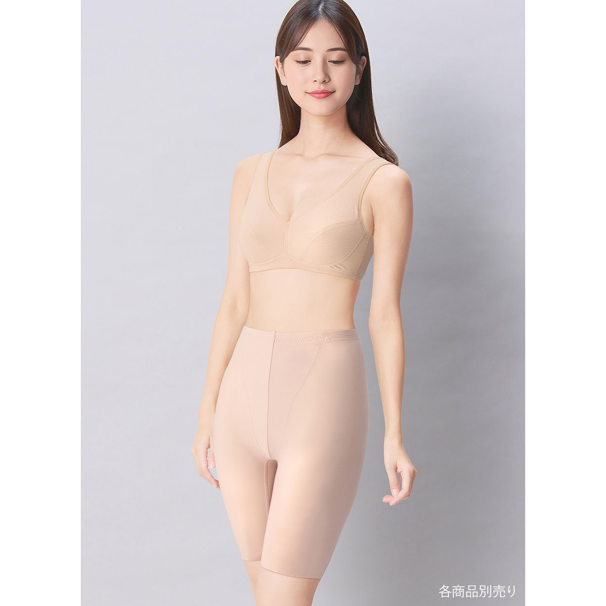 気になるおなかをフロントの裏打ちでやさしく押さえ、おしりはほどよいサポート力でヒップアップ。ヒップはギャザー加えて、きれいなまるみのあるヒップラインに。