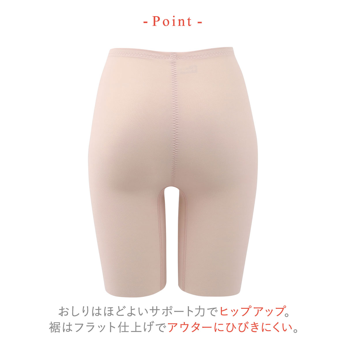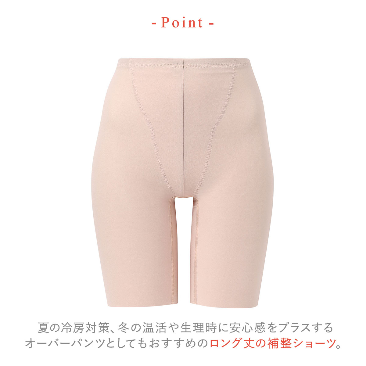 夏場の冷房対策、冬場の温活や生理時に安心感をプラスするオーバーパンツとしてもおすすめの、ロング丈補正ショーツです。