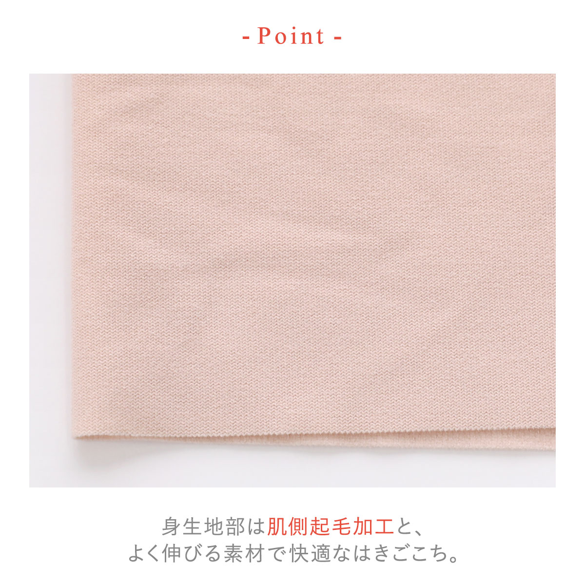 身生地はタテ・ヨコに良く伸びるやわらかな素材を使用しているので、はきやすく、ここちよいフィット感。肌側ふんわり起毛加工で肌ざわりがよく、快適な履き心地です。