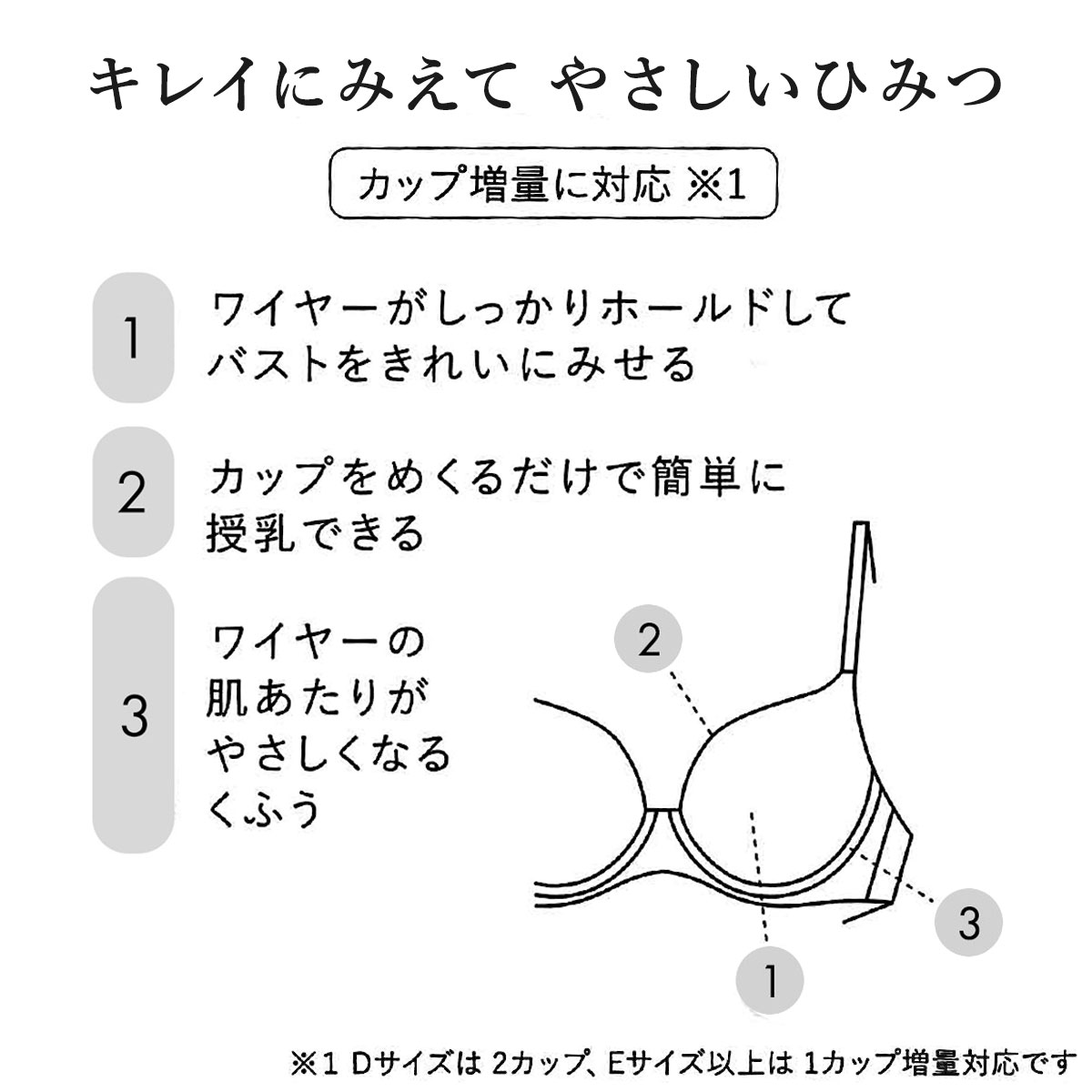 バストの変化に対応して快適にサポートする、授乳機能のついた産前・産後兼用ブラジャー。伸縮性のあるカップを使用し、産前から産後までのバストボリュームの変化に対応します。(※EFカップは1カップ増量が目安です)