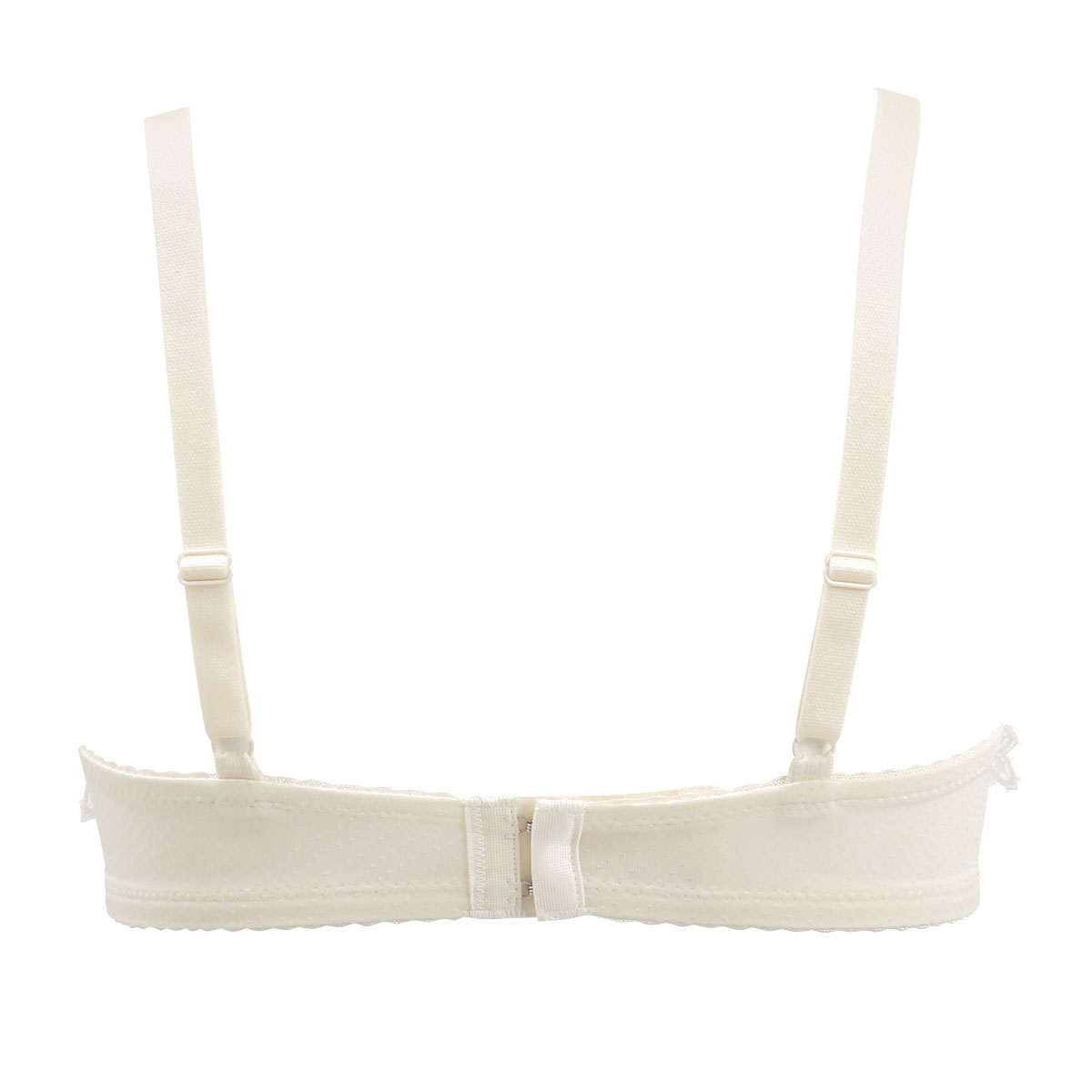 ヨーロッパの宮殿のバルコニーやドームのアーチを連想させる柄の編みレースの上に、宮殿の装飾のようなクラシカルで繊細な幾何学模様調のモチーフをケミカルアップリケで表現し、大切なバストをそっと包みこむように上品にあしらったデザインです。