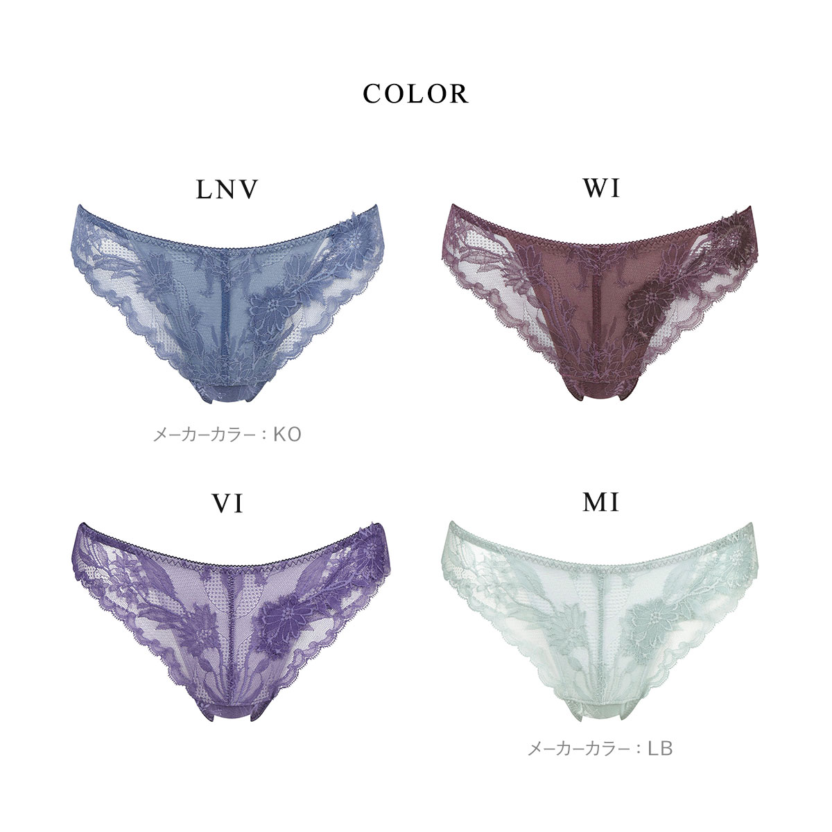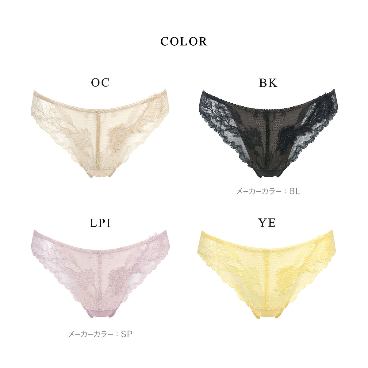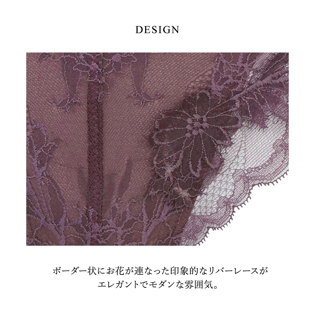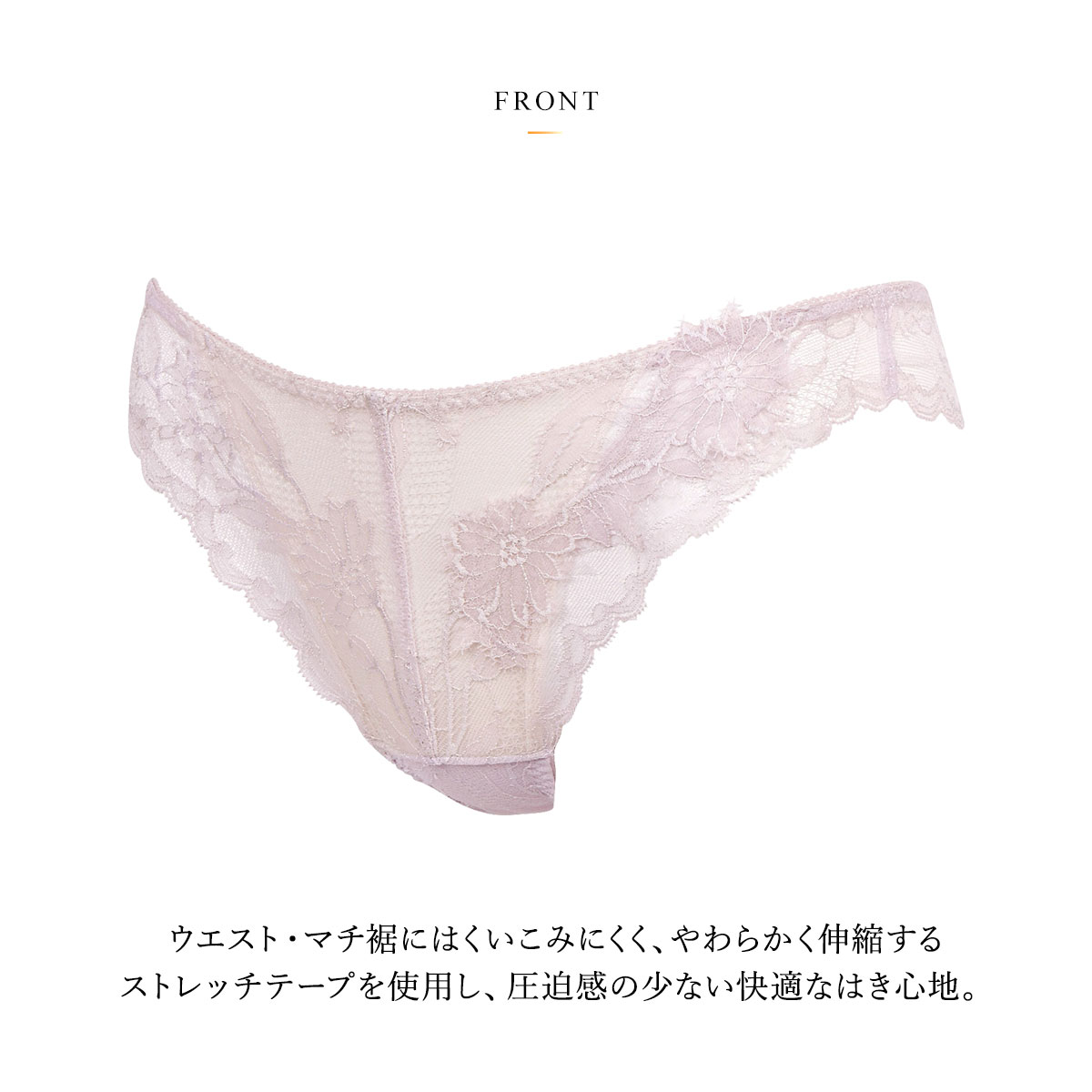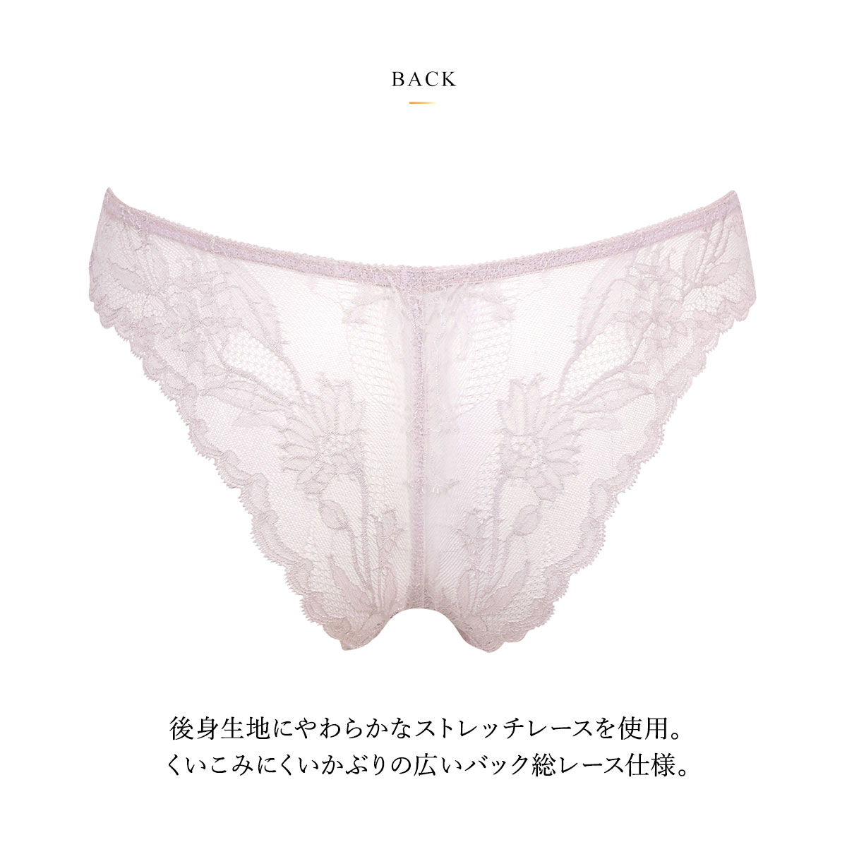 後身生地にやわらかなストレッチレースを使用。アウターにひびきにくく、くいこみにくいかぶりの広いバック総レース仕様で、ソング初心者の方もはきやすく安心感のあるデザインです。
