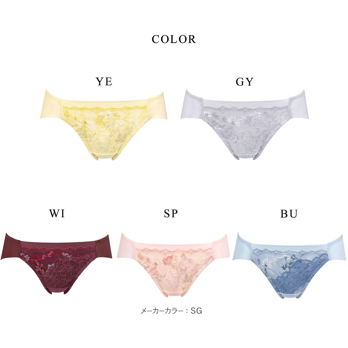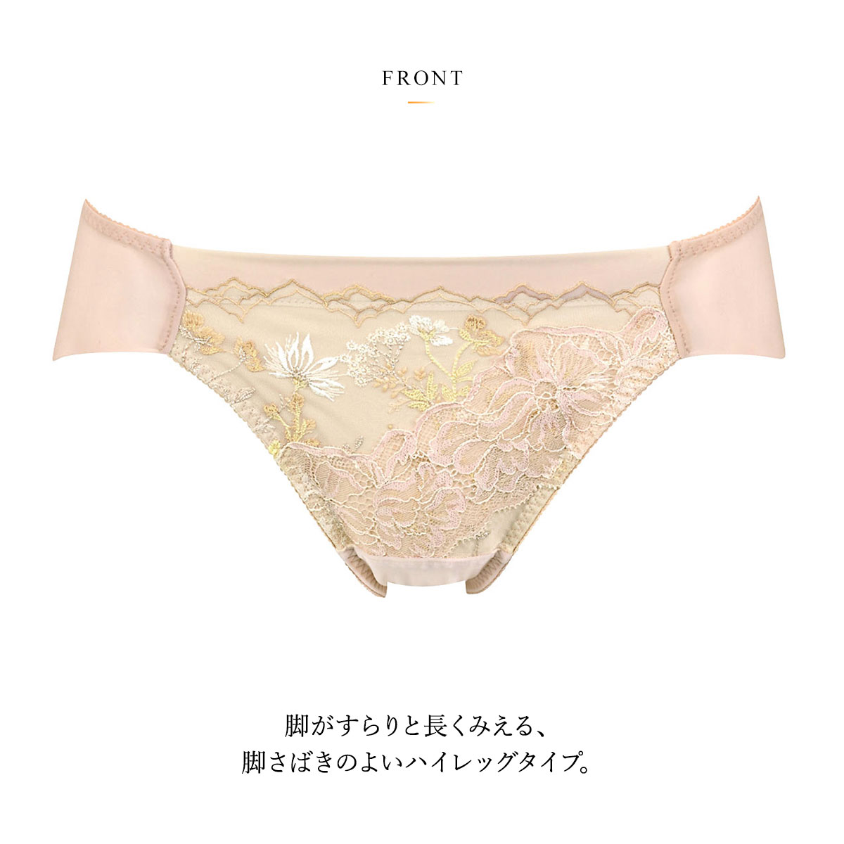 脚がすらりと長くみえる、脚さばきのよいハイレッグタイプ。フロントの小花柄刺繍レースと繊細なラッセルレースが華やかなデザイン。