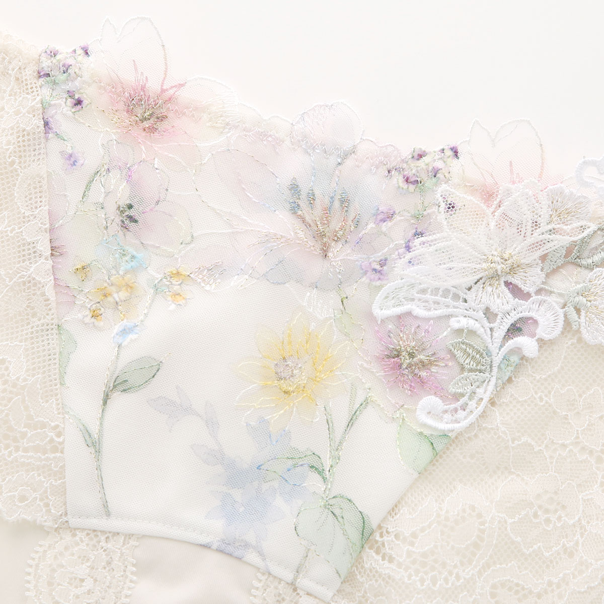 春の訪れを感じるような華やかで彩りのあるプリントと、ラメ糸のチュールエンブロイダリーレースが美しいデザイン。フロントには草花モチーフのケミカルアップリケに花を描いたチュールエンブロイダリーアップリケの立体加工で特別感を演出しています。