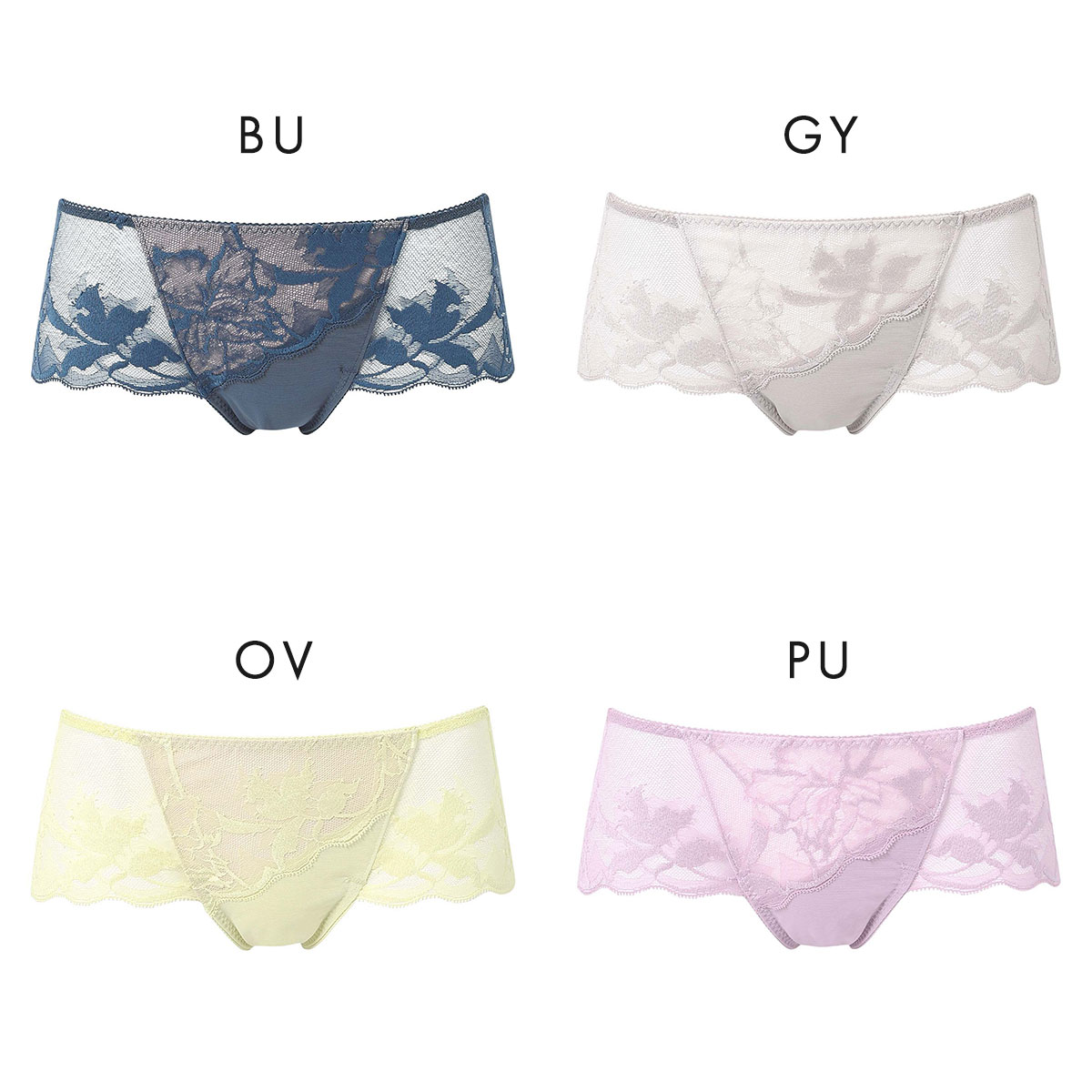 ウエストとマチ裾は伸びのよいストレッチテープを使用し、ここちよくフィット。バックは総レースでアウターにひびきにくい仕様です。フロントは裏打ちつきで透けにくく、やさしい肌あたりです。