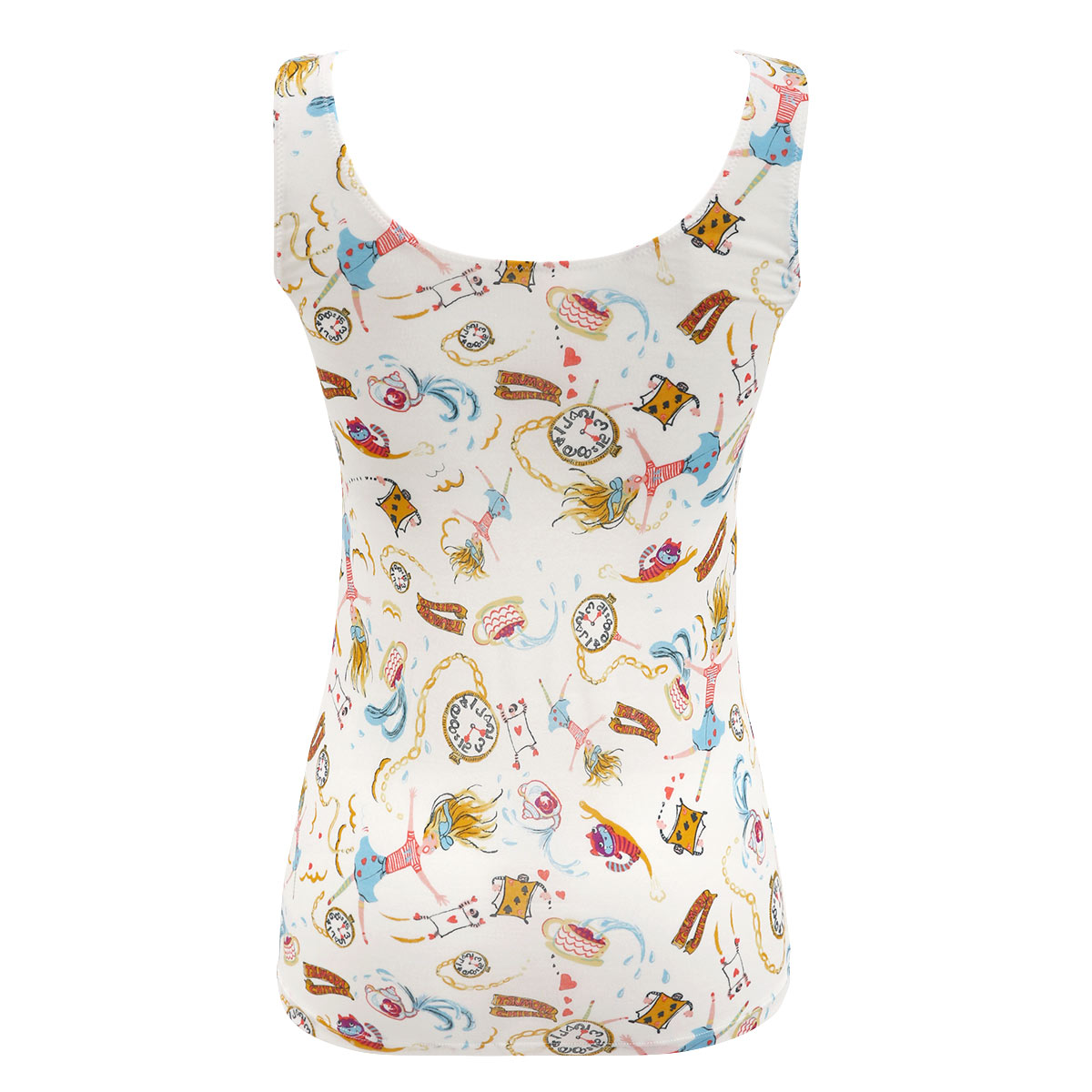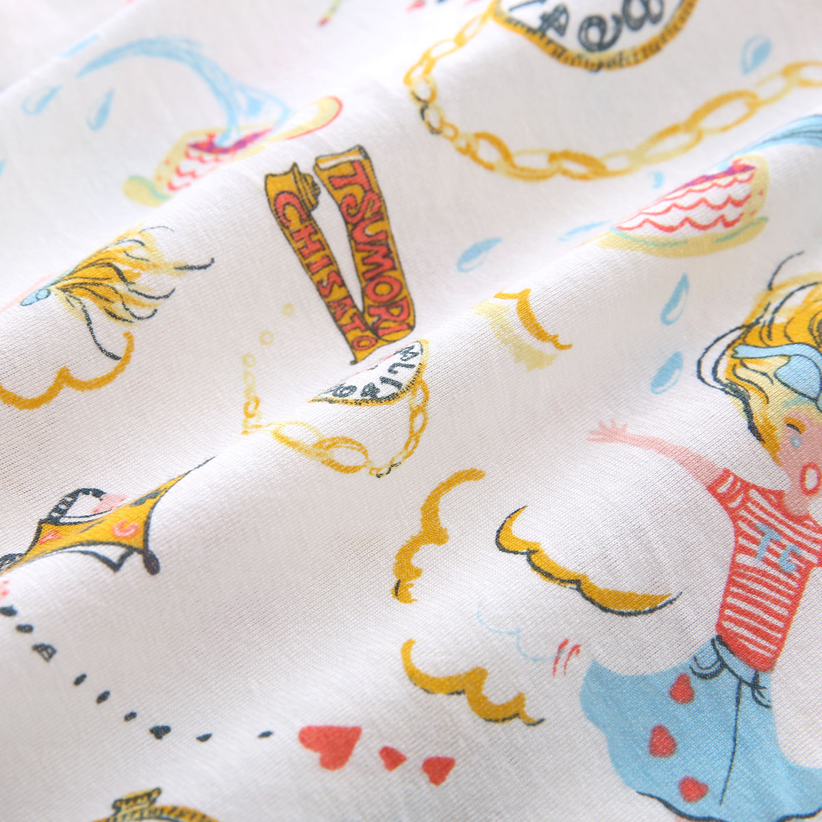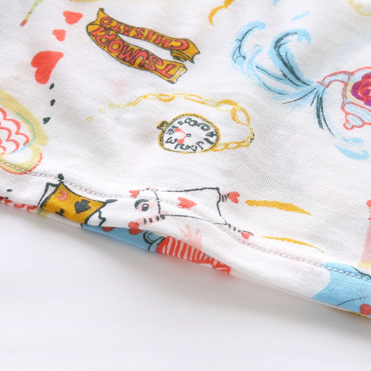 不思議の国の時空間に迷いこんだ女の子と仲間たちや、ティーカップやポットが浮遊している様子を表現したファンタジックなデザイン。