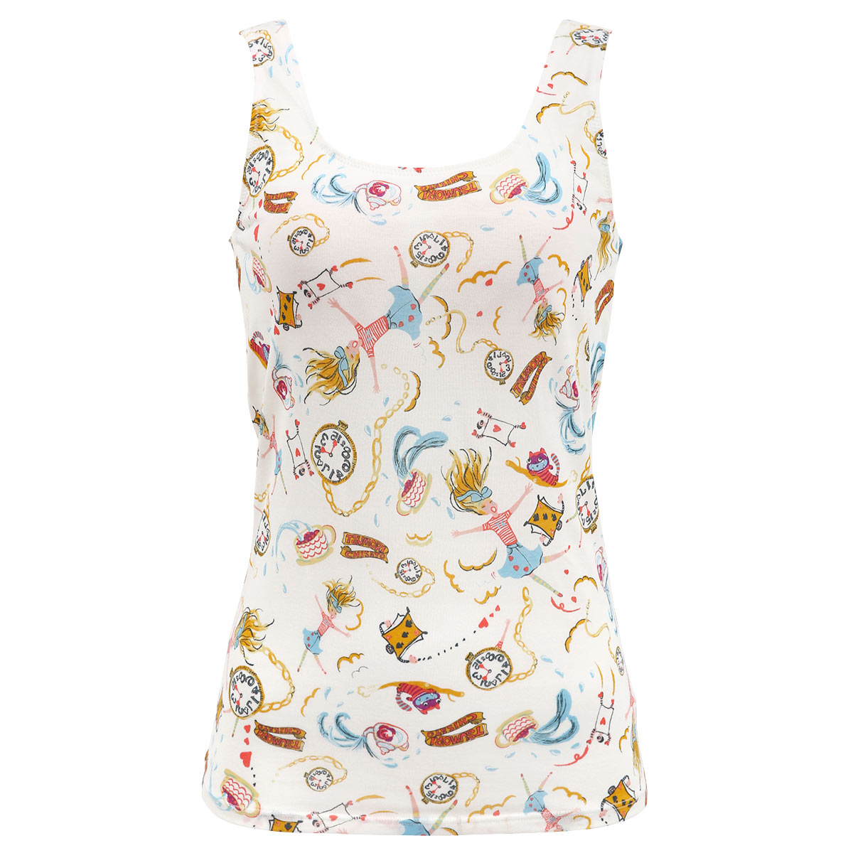 不思議の国の時空間に迷いこんだ女の子と仲間たちや、ティーカップやポットが浮遊している様子を表現したファンタジックなデザイン。