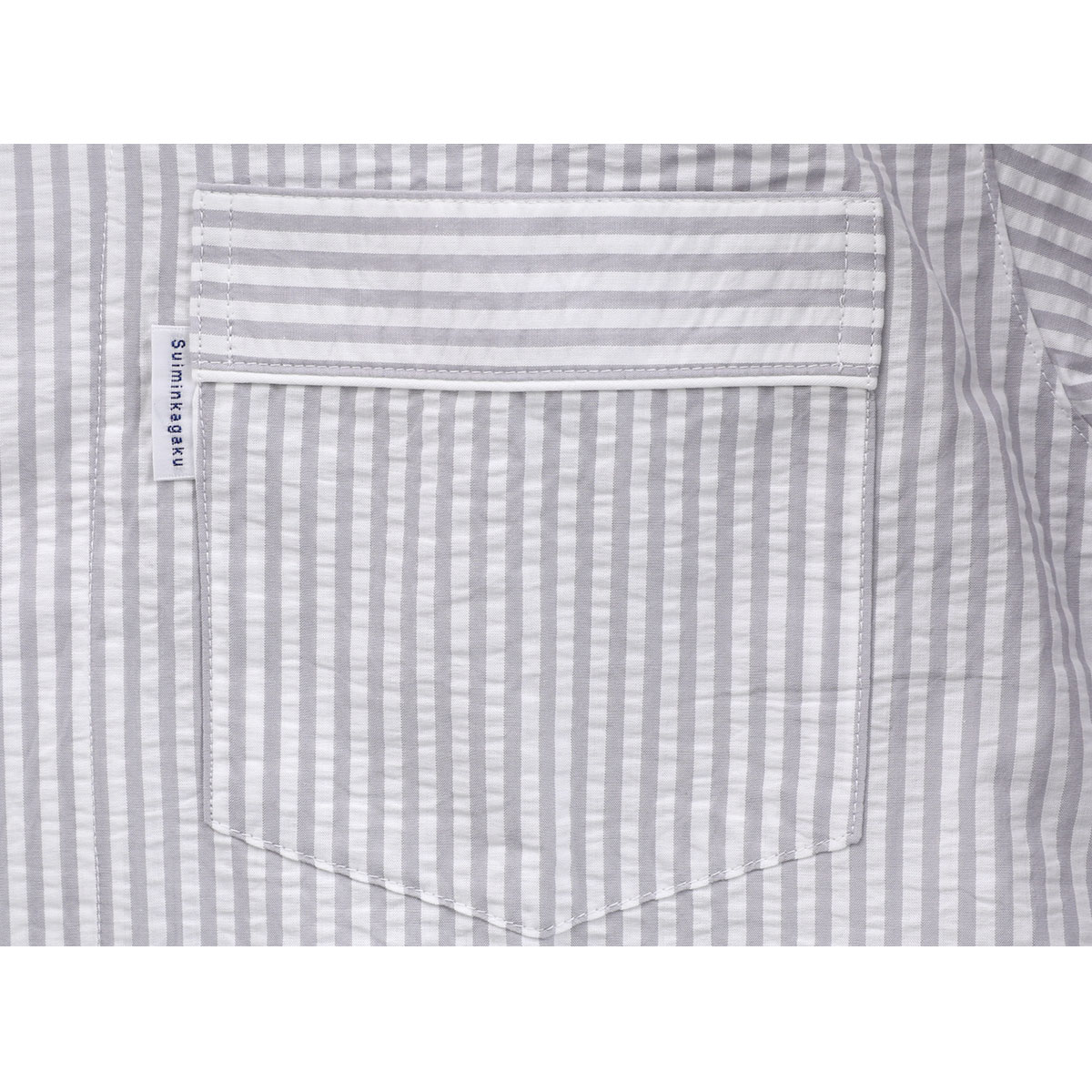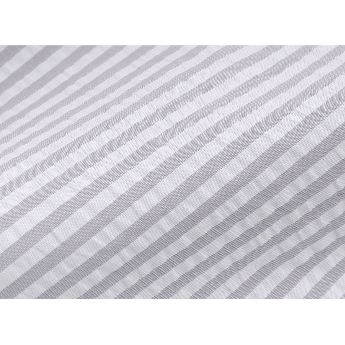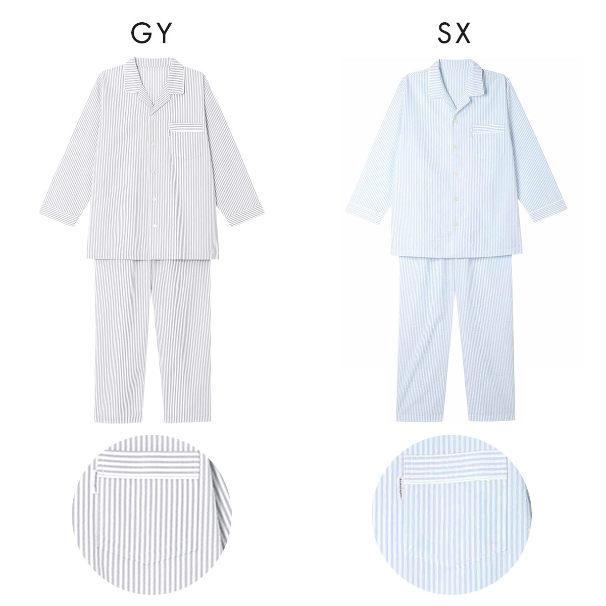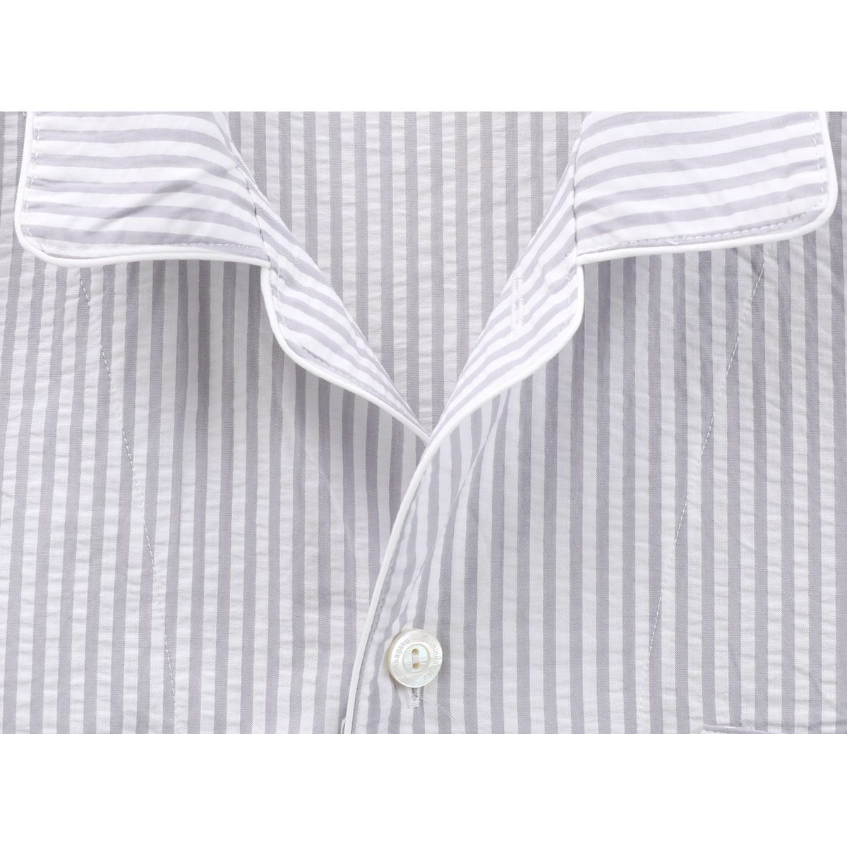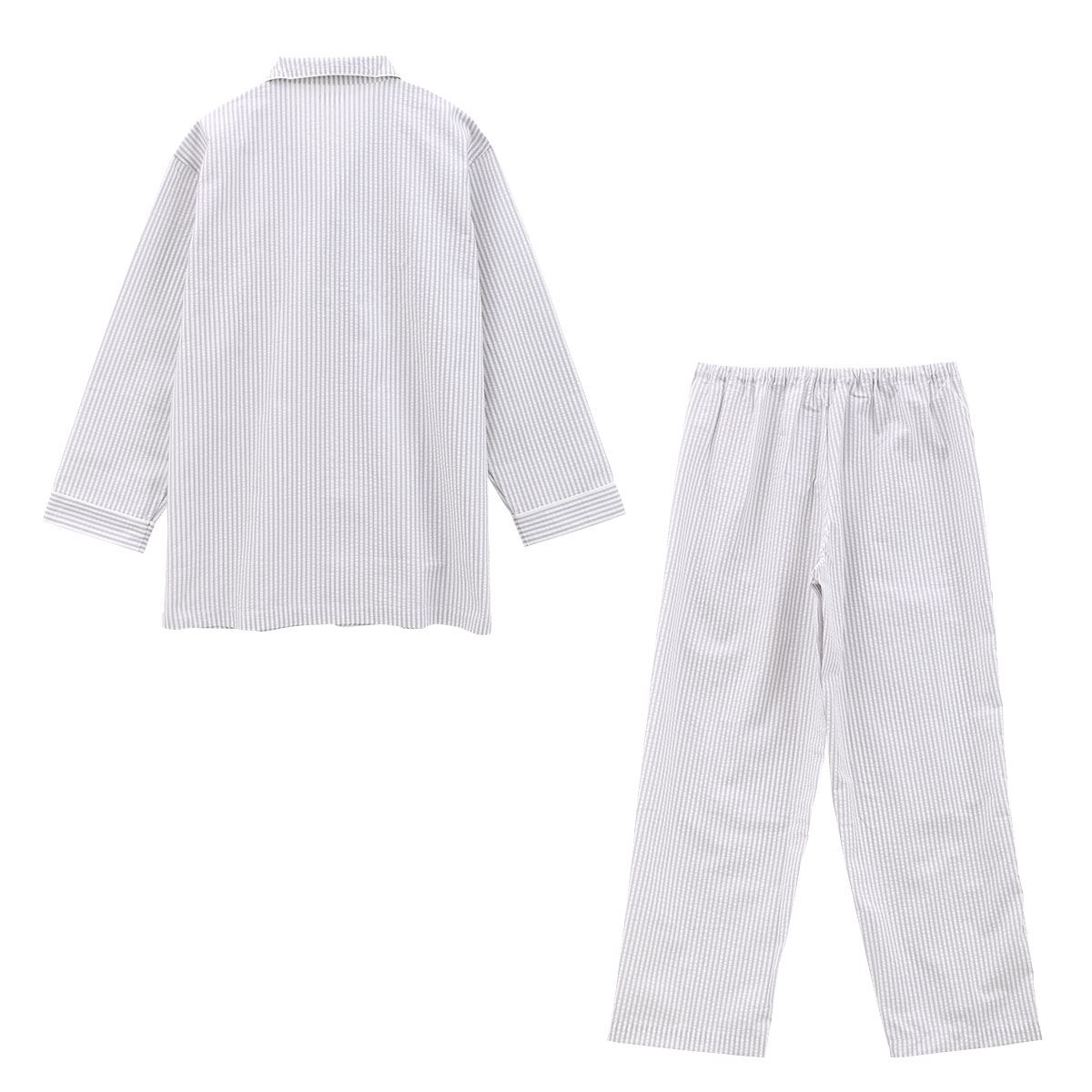 パイピングをアクセントにきかせたデザインの、ストライプシャツパジャマ上下セット。タテ糸を調節して、表面に波状のシボ(シワ模様)をつけたサッカー素材を使用しています。肌ばなれがよく、さらっとした風合いで快適な着用感。