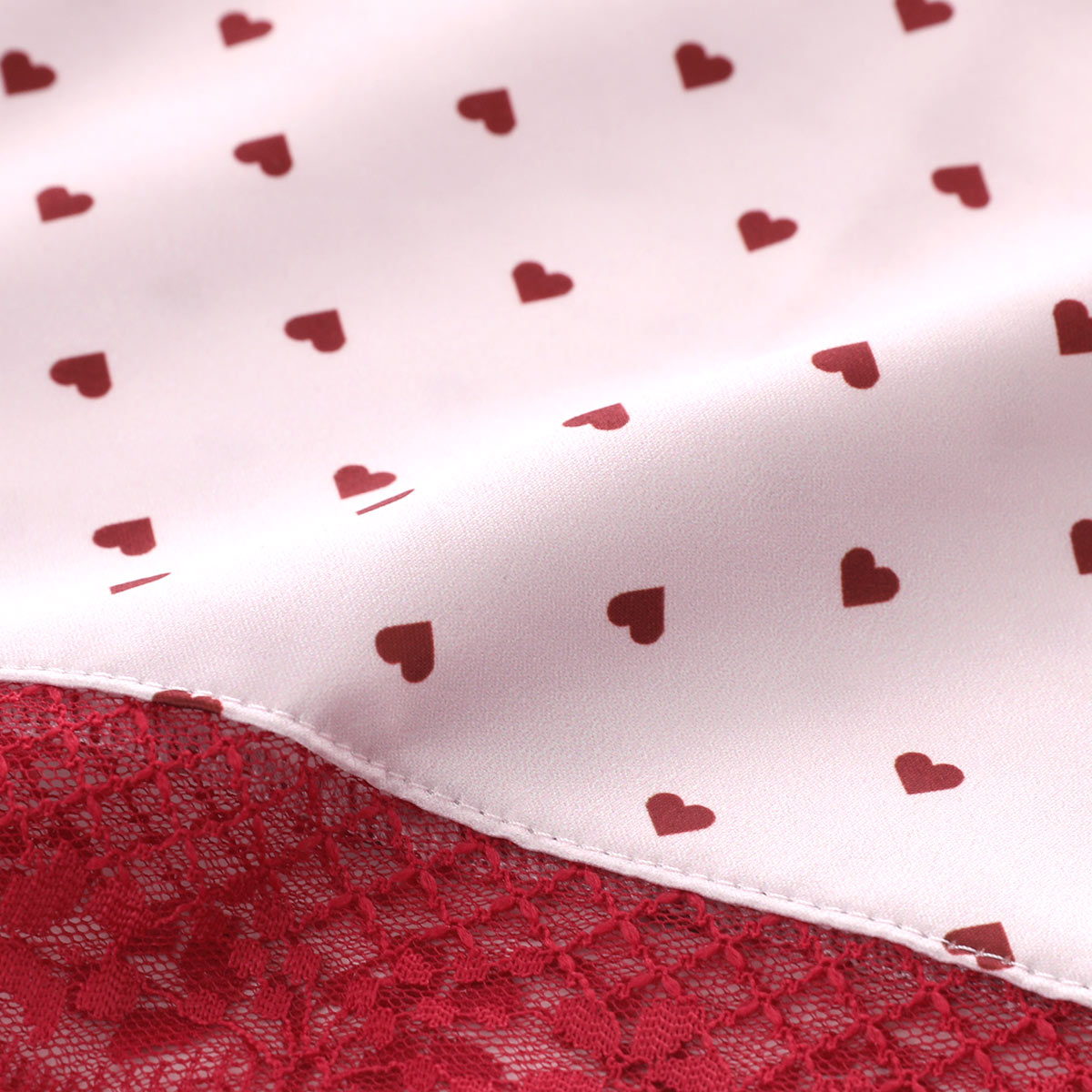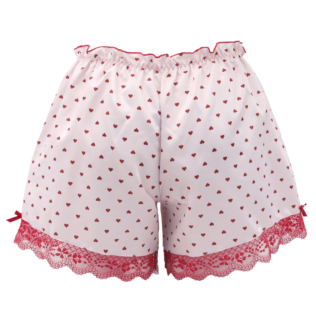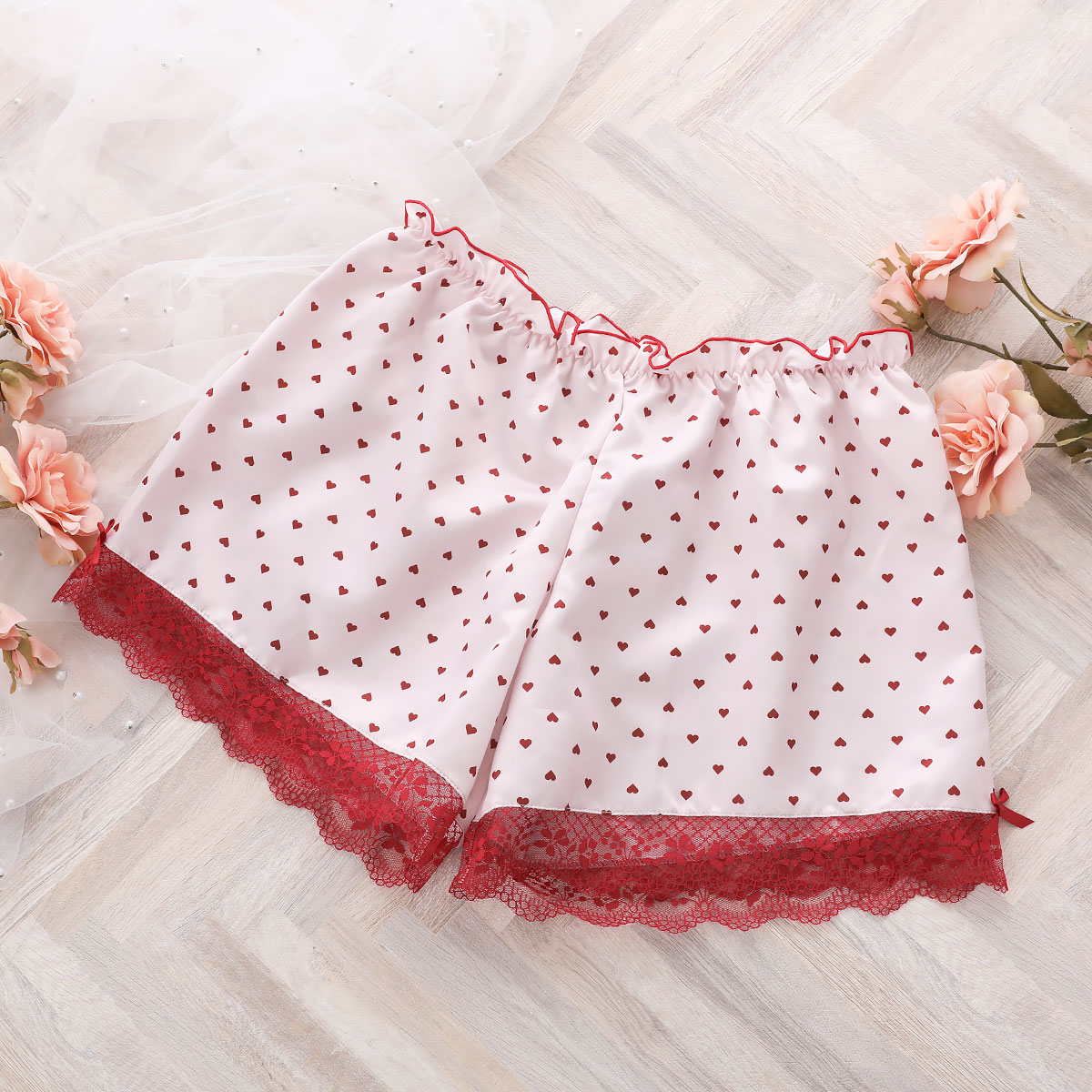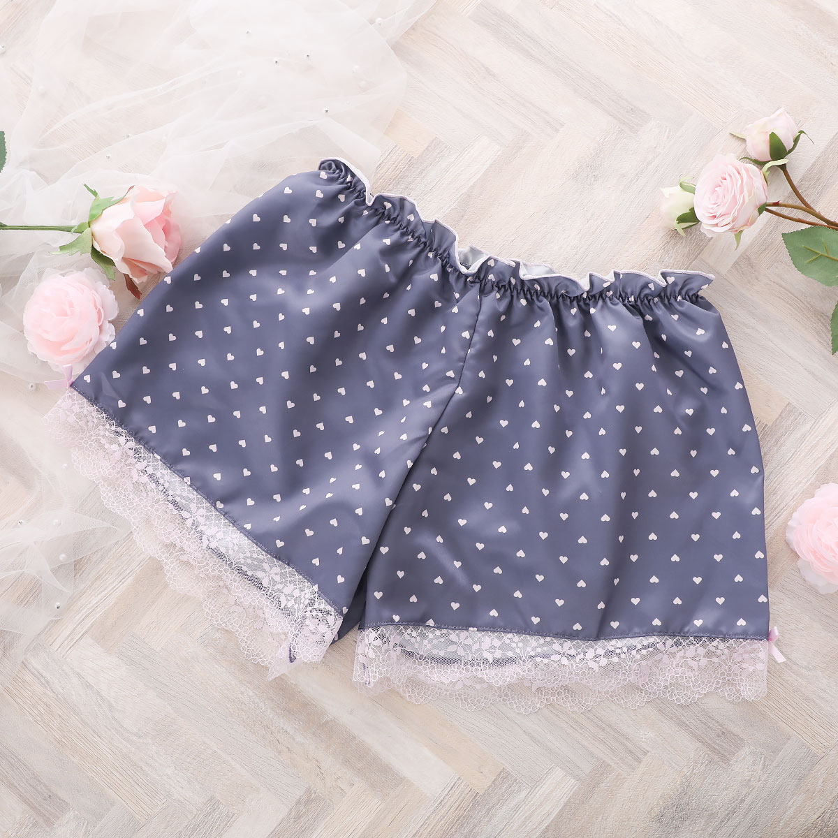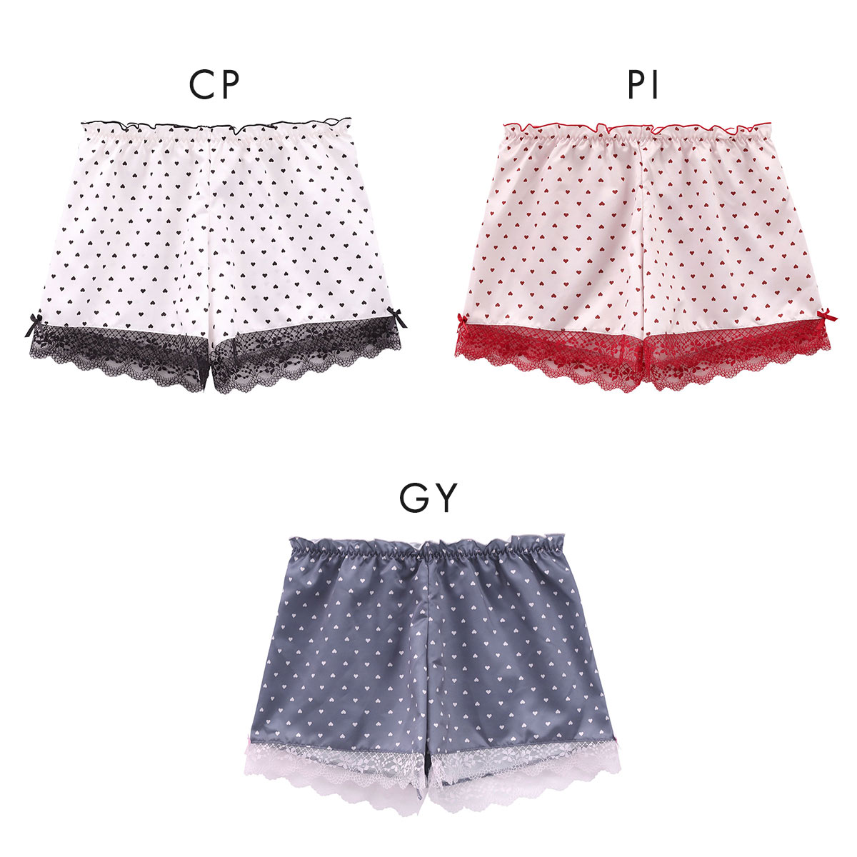 ミニハート柄のサテンにレースのあしらいでセクシー&キュートに仕上げたタップパンツ。レースと同色のミニリボンをサイドに付けて、アクセントを添えています。