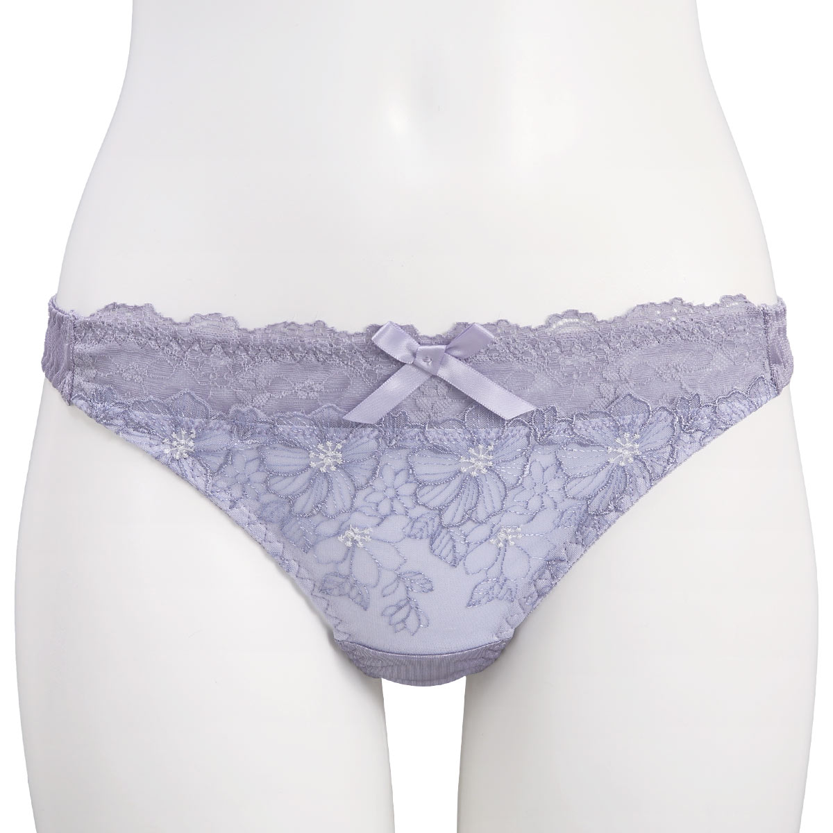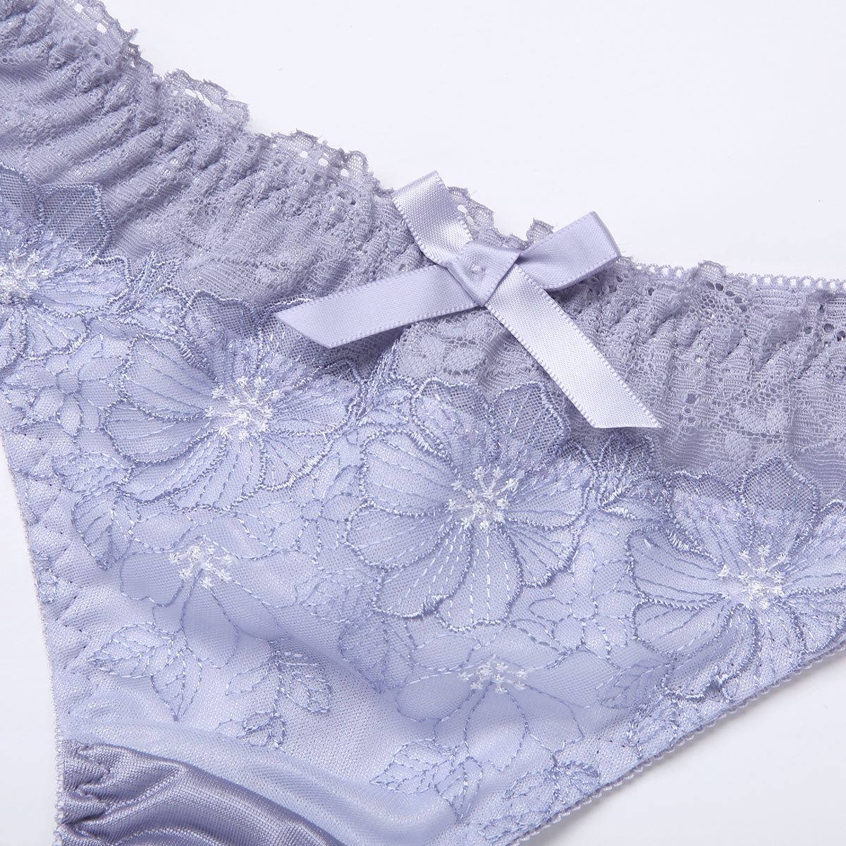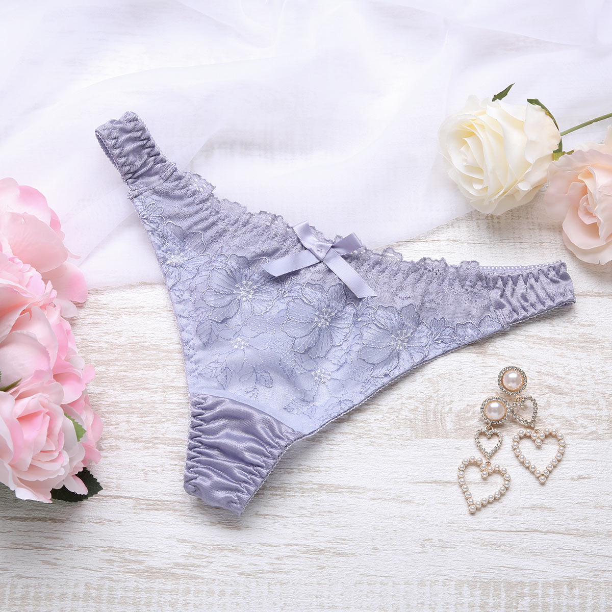 線描き風のフラワー刺繍レースとストレッチレースでフェミニンに仕上げたTバックショーツ。