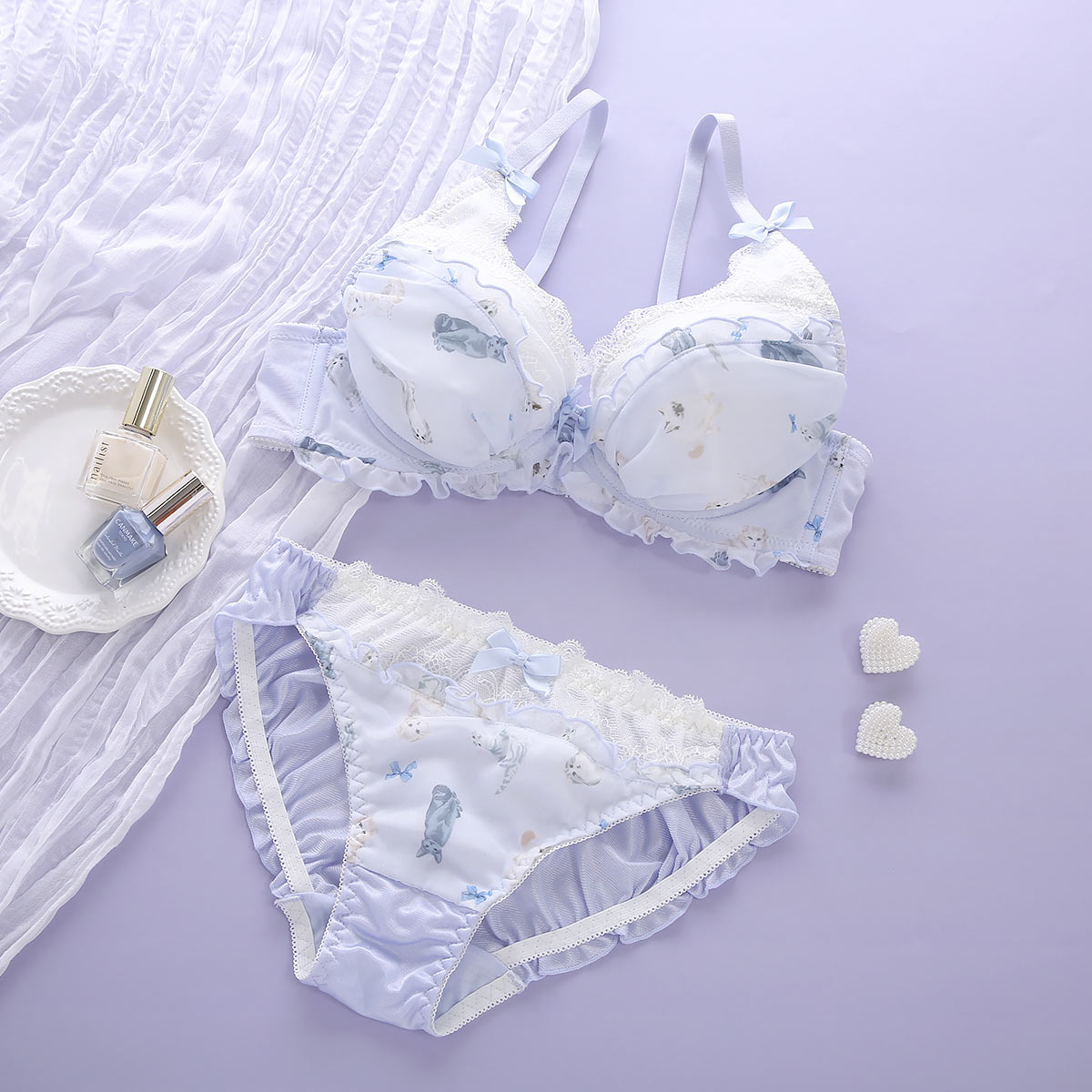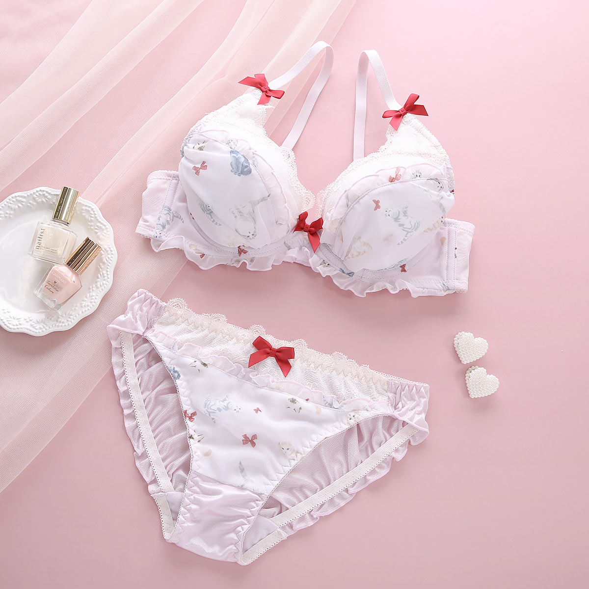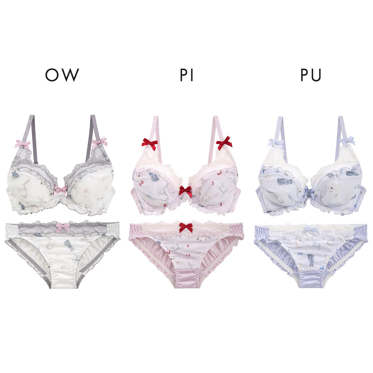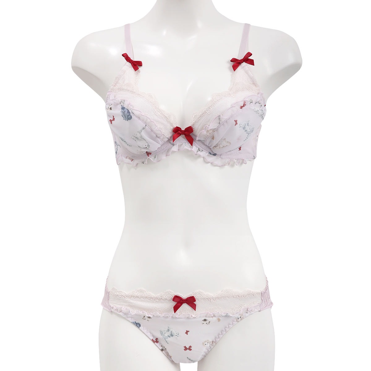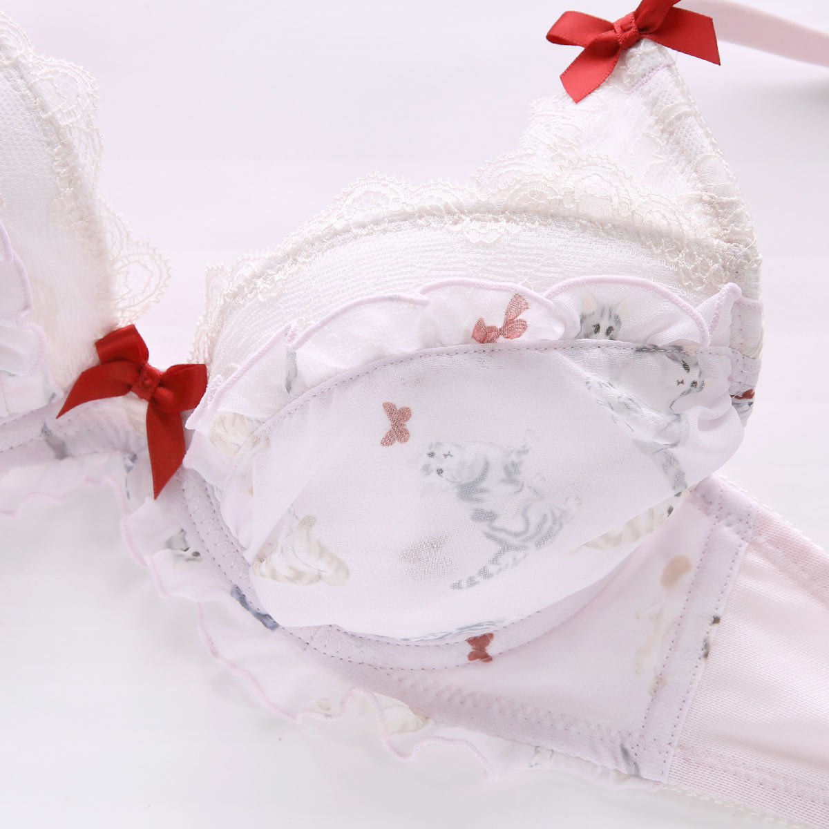 色んな種類の猫を水彩タッチで優しく描いた、ふんわりシフォンのキュートなブラセット。配色サテンリボンやひらめくフリルがアクセントになっています。