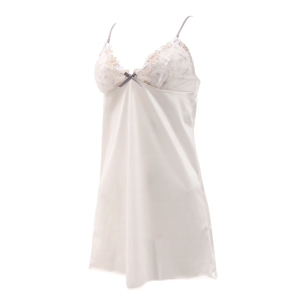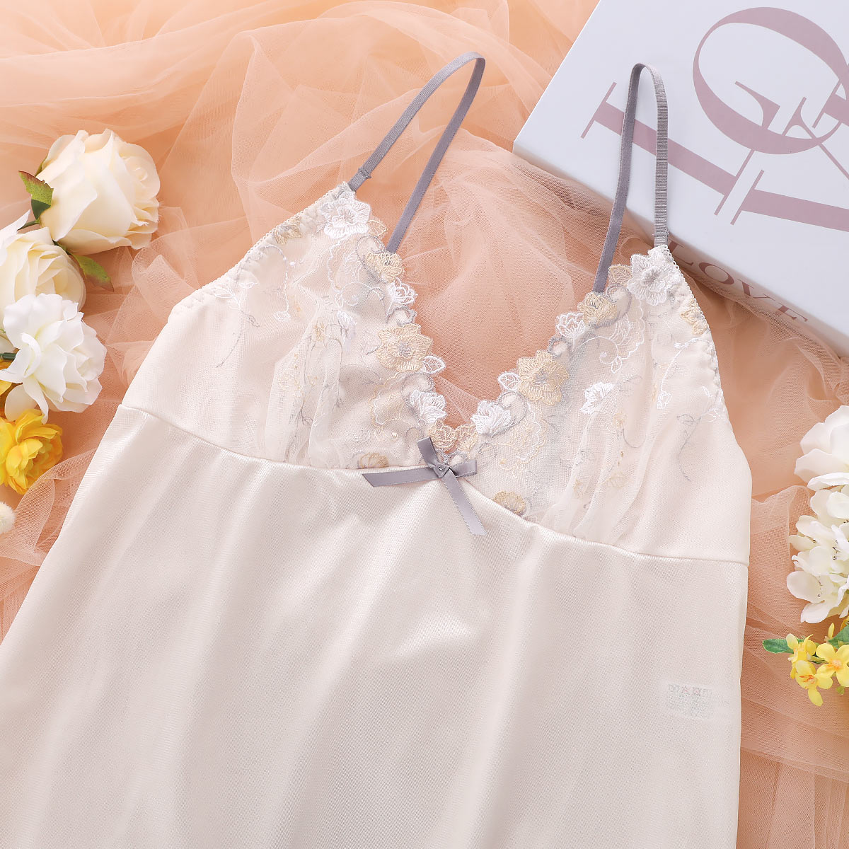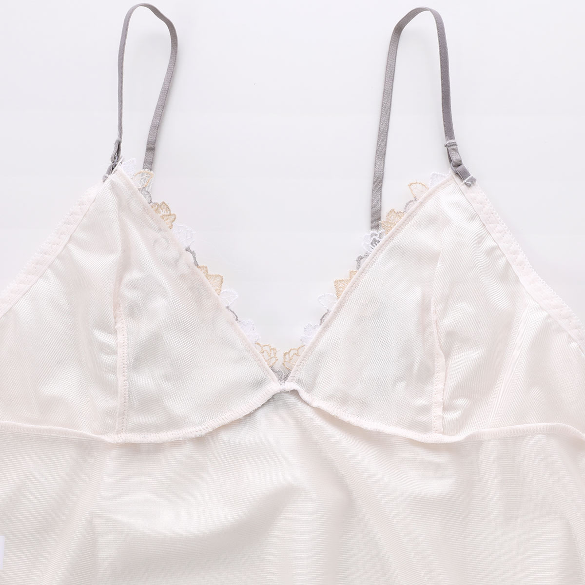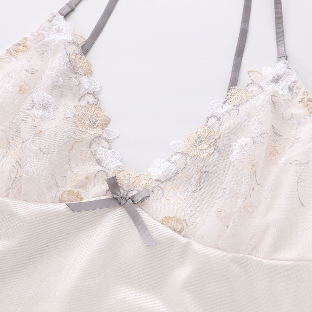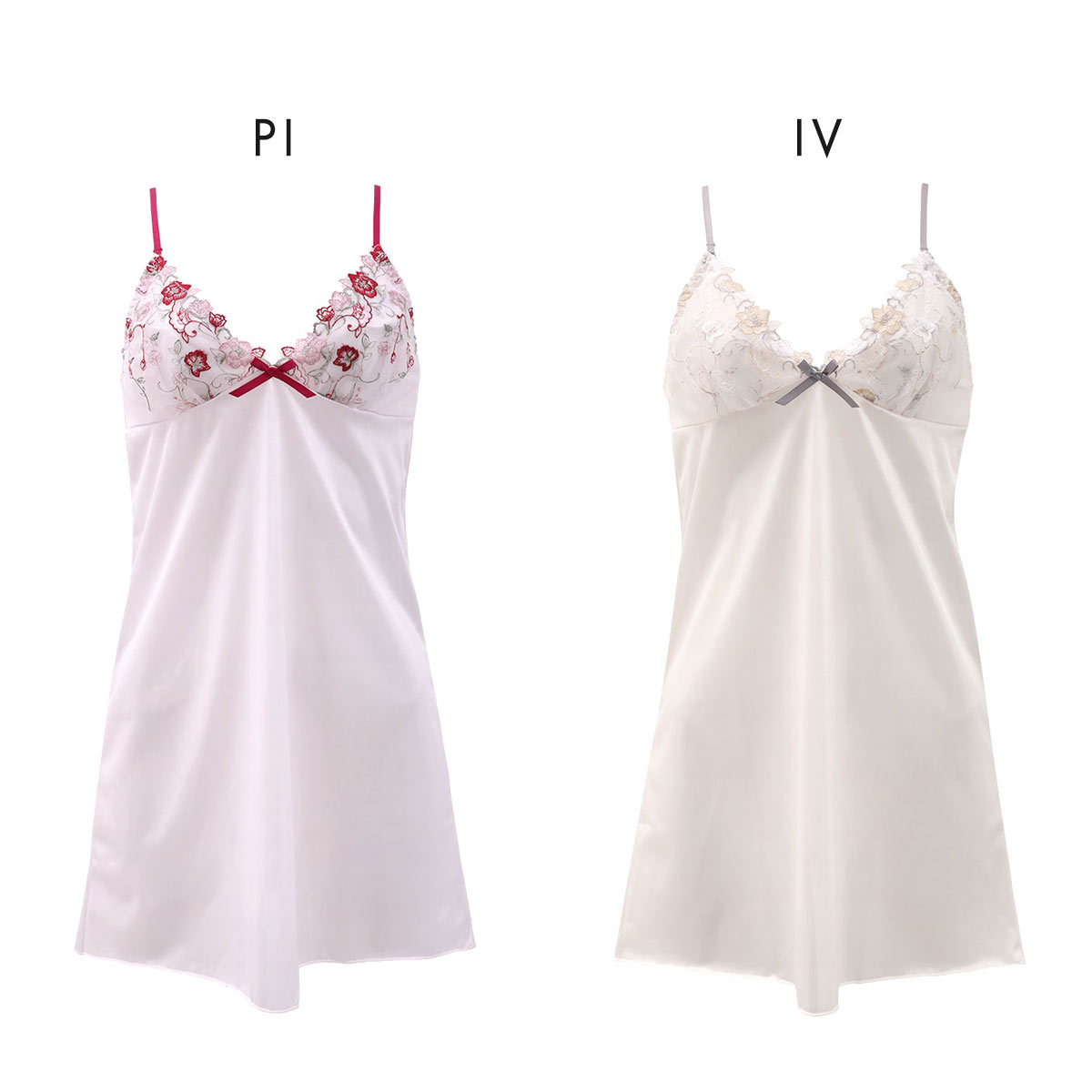 小花刺繍レースが胸元を彩るフェミニンな雰囲気のスリップ