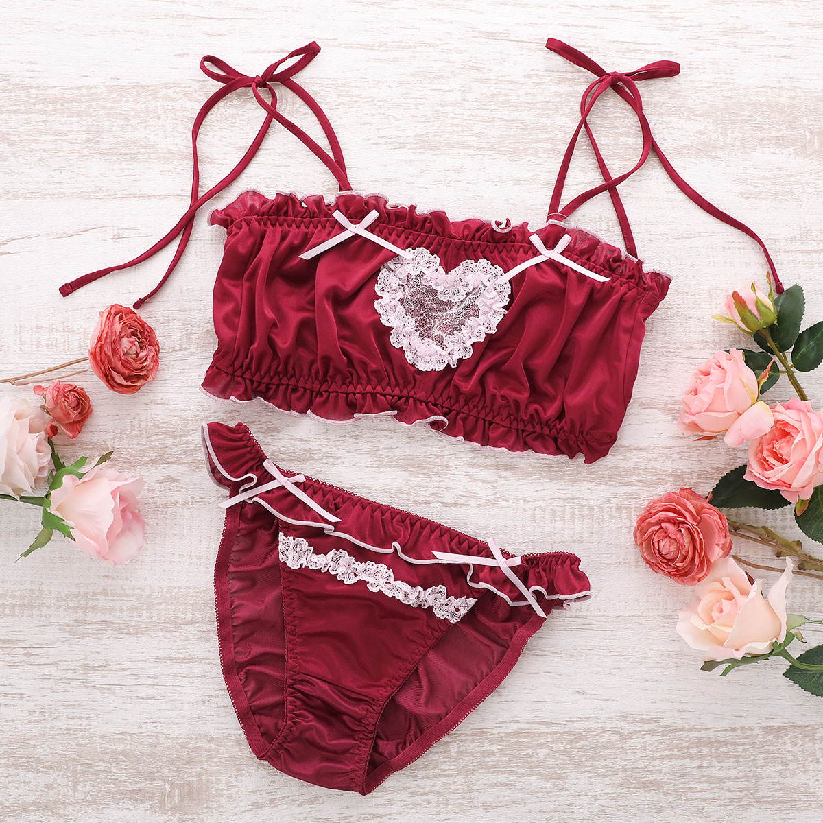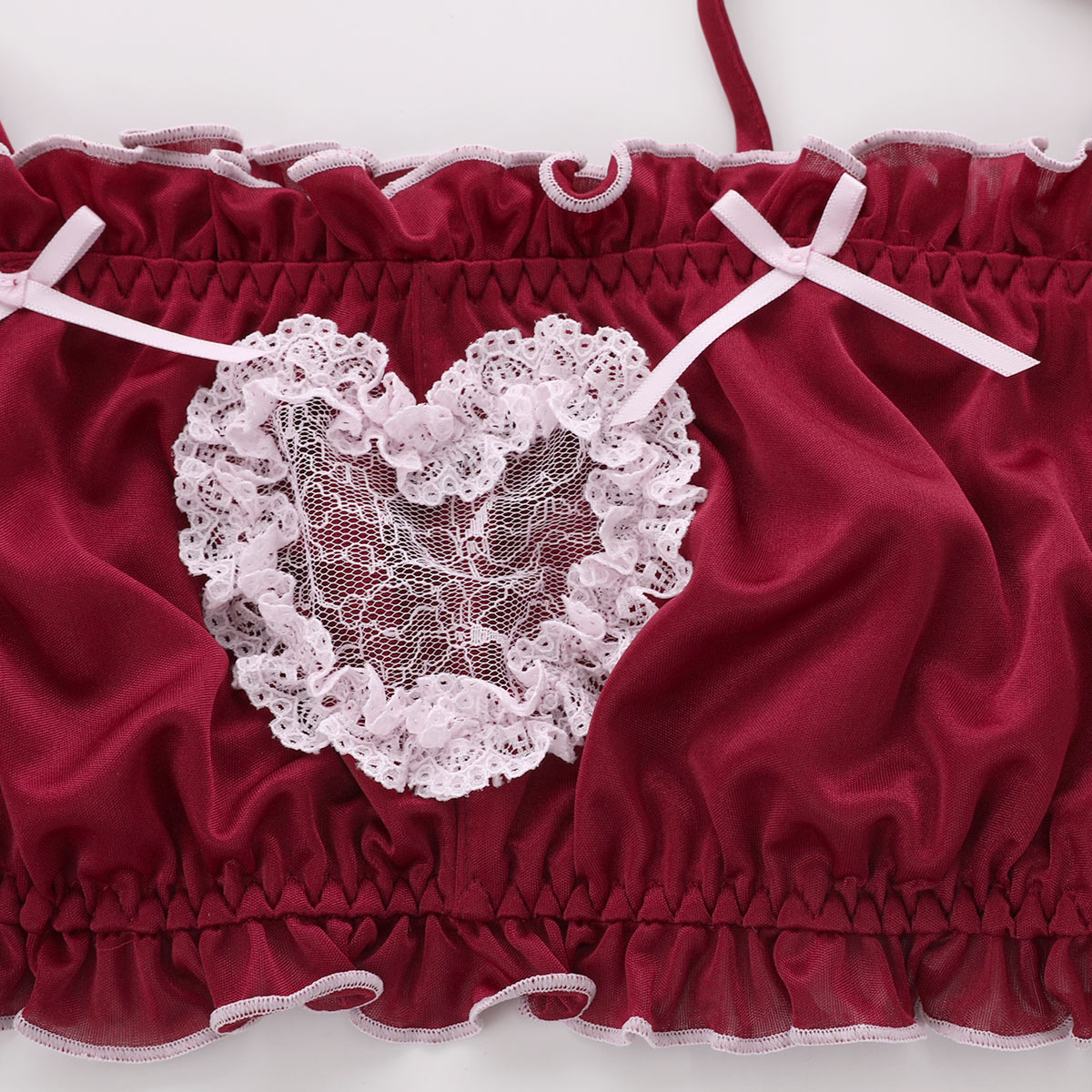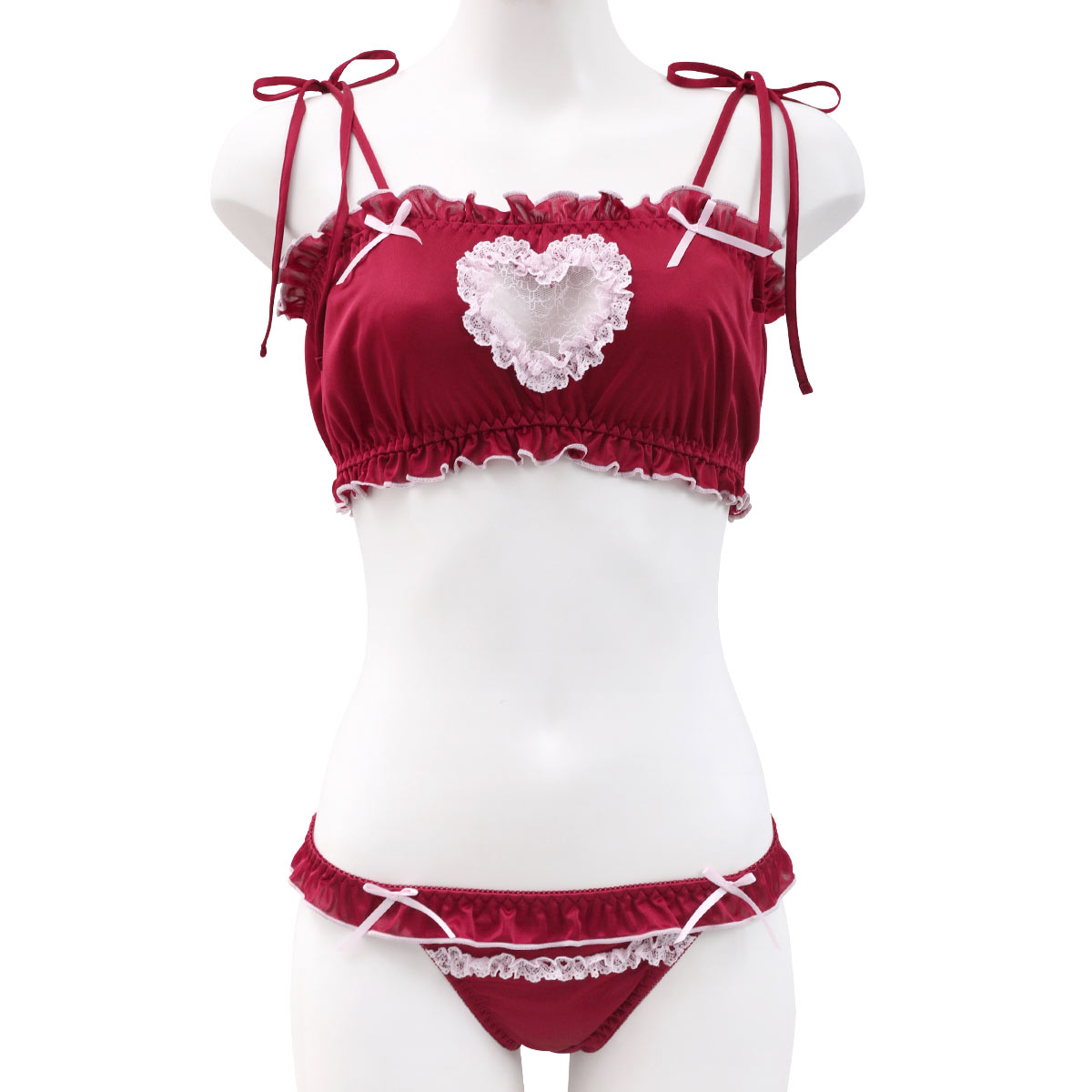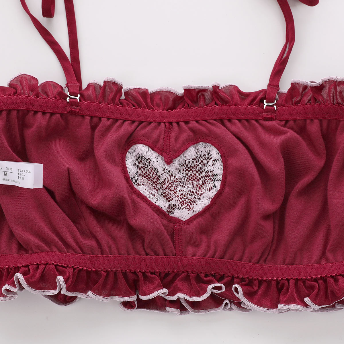 ブラジャーは、ハートモチーフのレースから透ける胸元がセクシーなデザイン。上辺下辺ともゴムで伸縮するので、着脱らくちんです。肩紐は結ぶタイプで調整が効くのも嬉しいポイント。