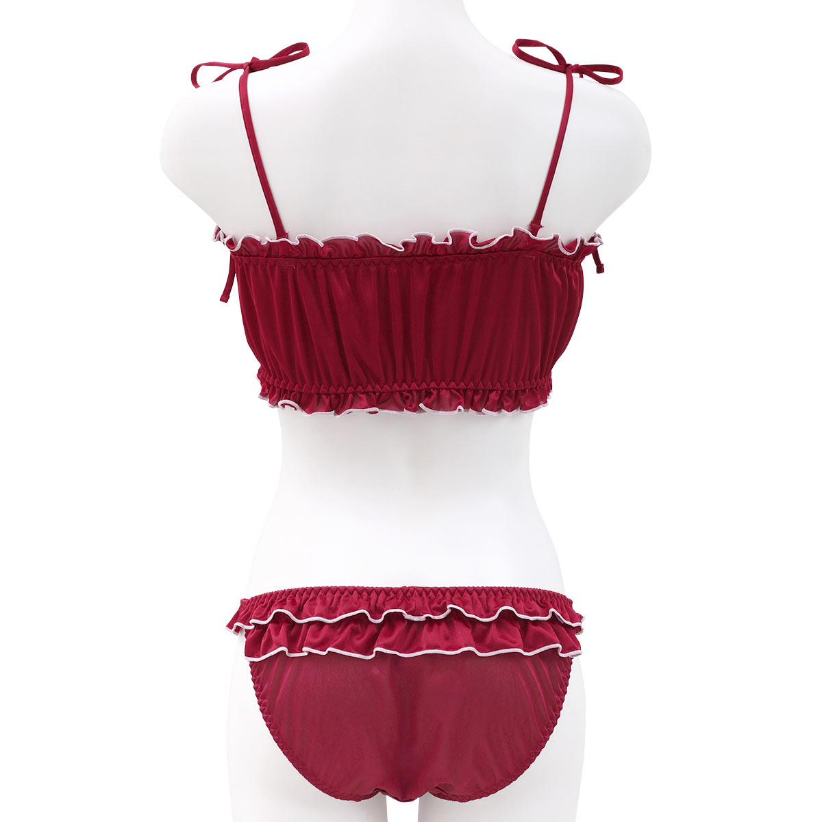 艶やかサテンにレースのアクセントでコケティッシュなムードを演出するチューブ風ブラセット。配色メロウのフリルとミニリボンをあしらい、可愛らしさもプラスしています。