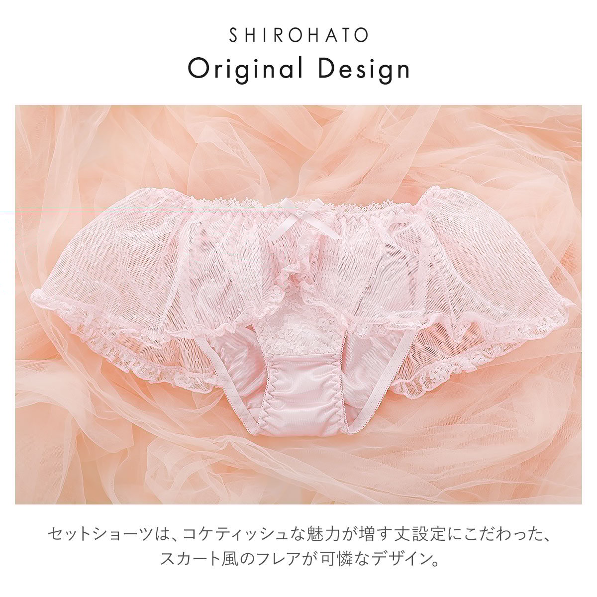 セットショーツは、コケティッシュな魅力が増す丈設定にこだわった、スカート風のフレアが可憐なshirohatoオリジナルデザイン。 ブラジャーとお揃いのリボンで、バックスタイルもキュートに演出してくれます。