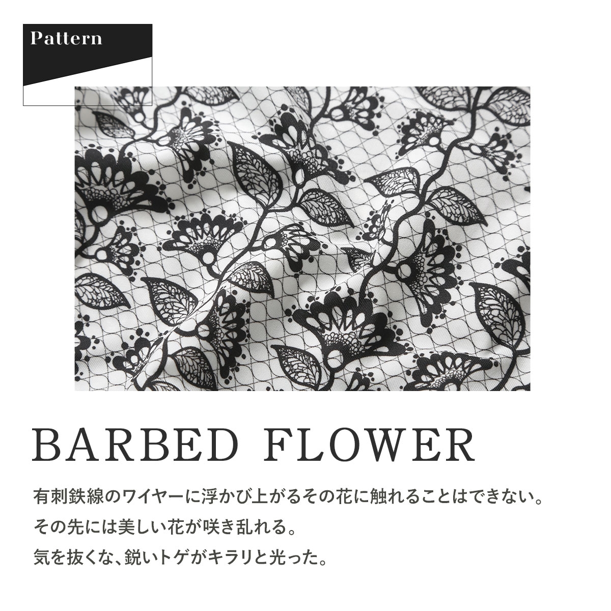 【BARBED FLOWER】有刺鉄線のワイヤーに浮かび上がるその花に触れることはできない。その先には美しい花が咲き乱れる。気を抜くな、鋭いトゲがキラリと光った。