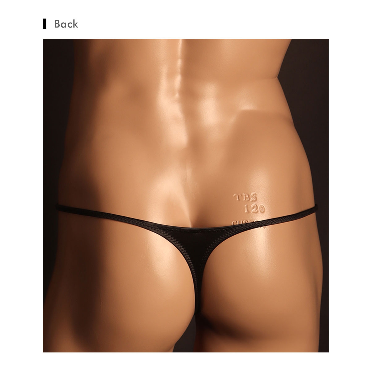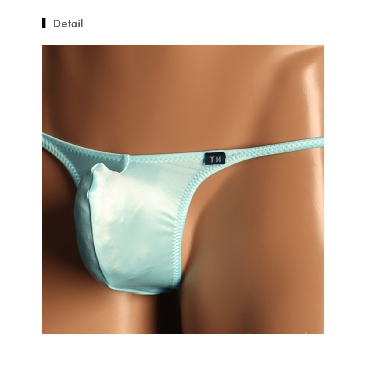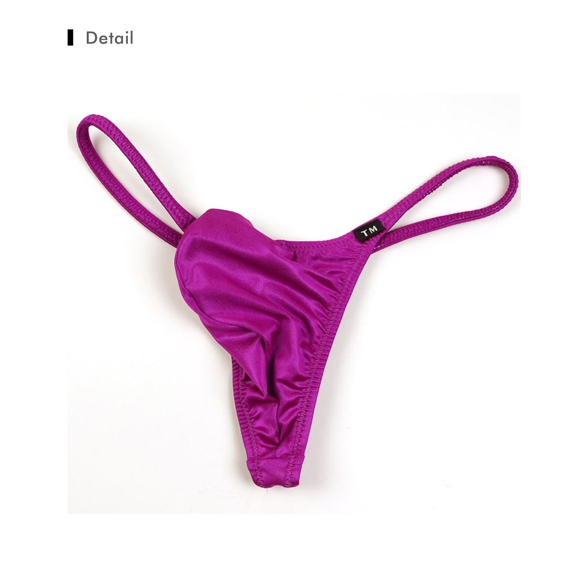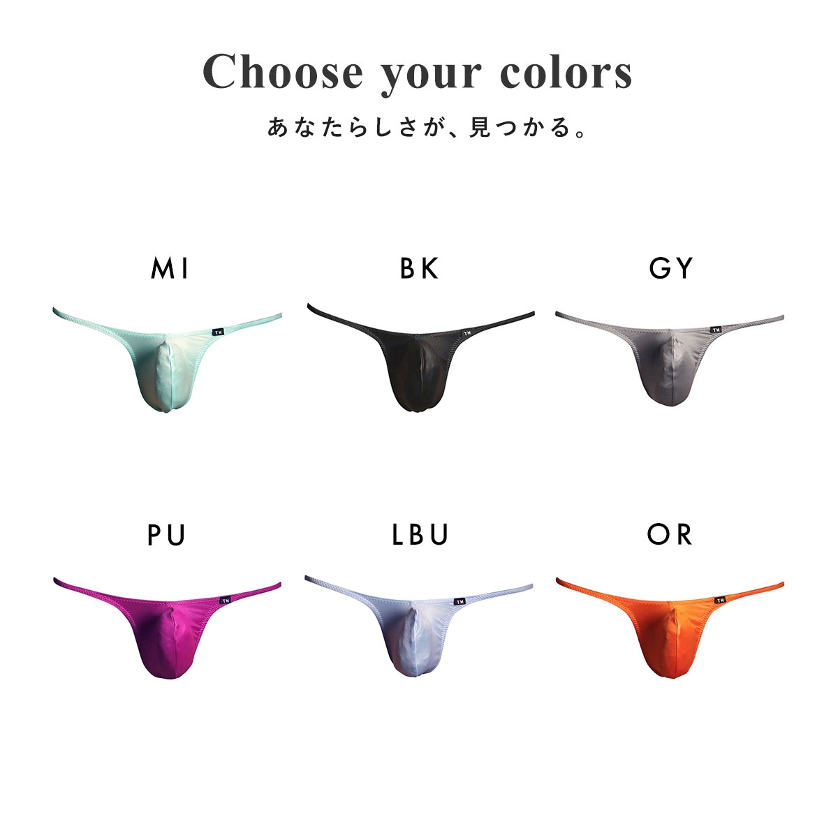 サテンのような光沢が綺麗なストレッチ素材YKSを使用したもっこりシャープスタイルの上向き収納バージョンのTバックビキニです。ジャストインパクトとは違いなめらかな曲線で上向きにもっていくパターンです。