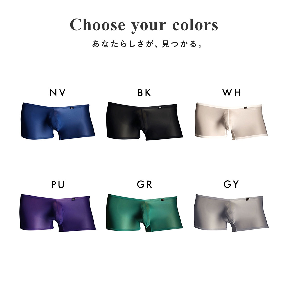 カラーNV-ネイビー、BK-ブラック、WH-ホワイト、PU-パープル、GR-グリーン、GY-グレー