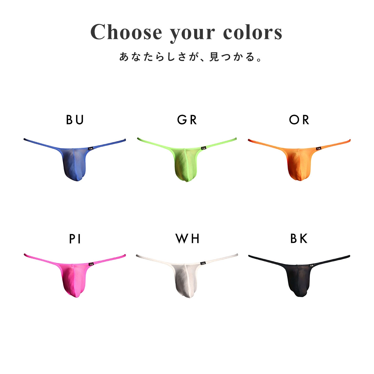 カラーBU-ブルー、GR-グリーン、OR-オレンジ、PI-ピンク、WH-ホワイト、BK-ブラック