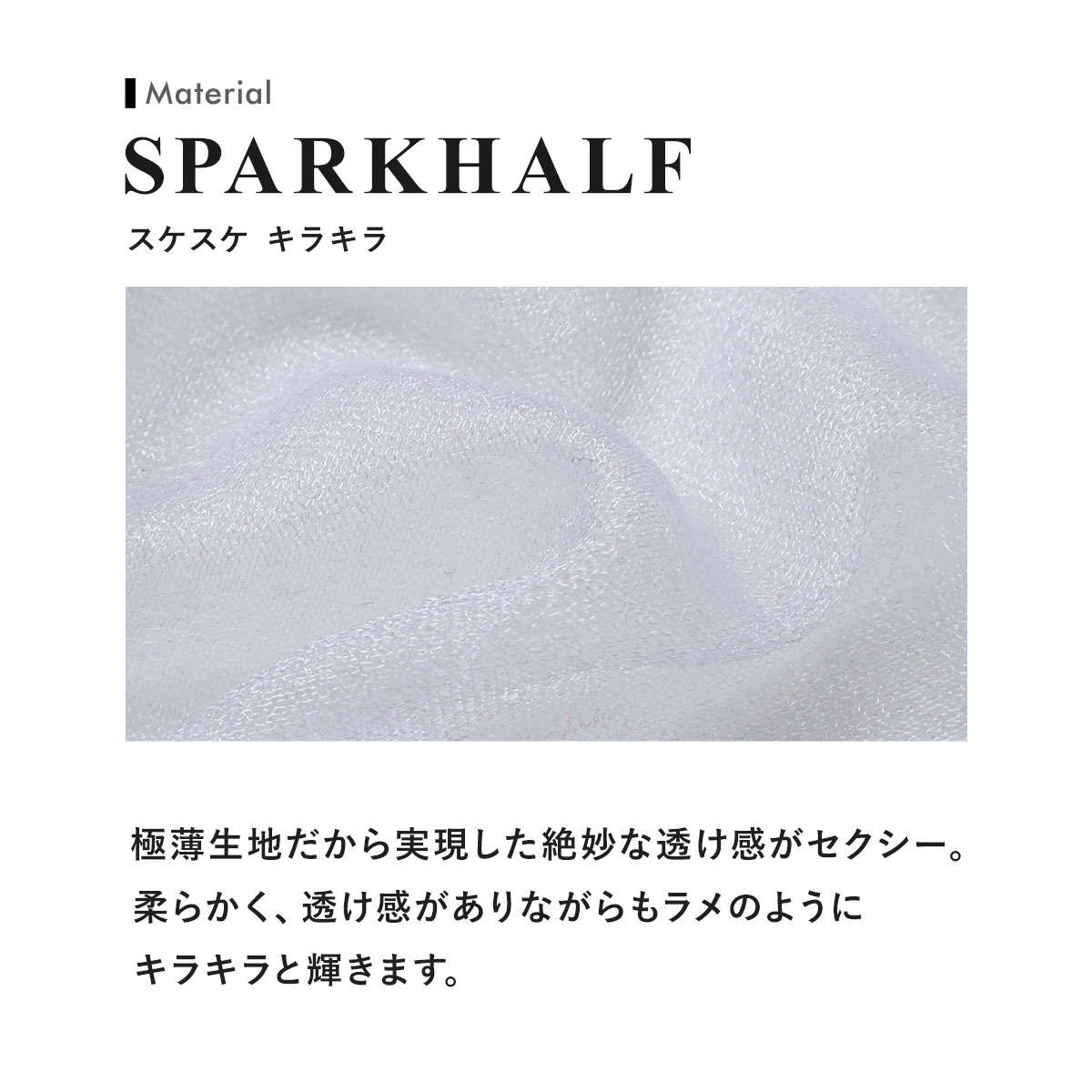 身生地にキラキララメラメのシースルー素材(スパークハーフ)、バインダーにはWETを使用したコンパクトでスタイリッシュなGストリングです。シャープなカッティングとフロントを強調させるようなパターンでバックはYバック調に仕立てています。