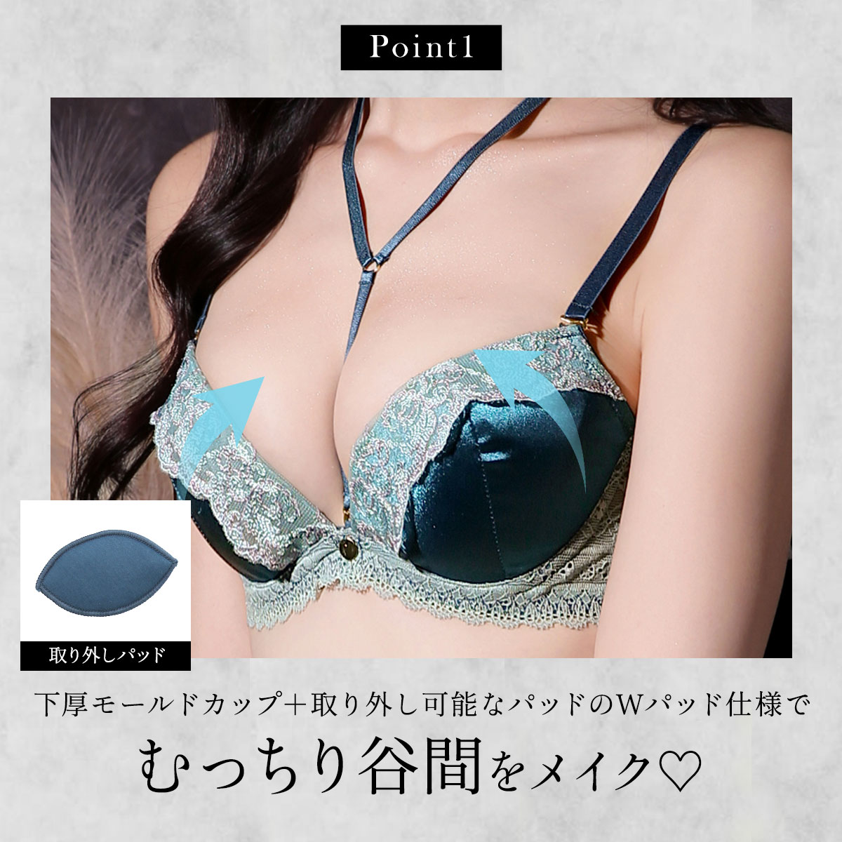 ブラはもっちり下厚モールドカップ+取り外し可能なパッドのWパッド仕様でむっちり谷間をメイク。バストボリュームの調整ができるのも嬉しいポイントです。