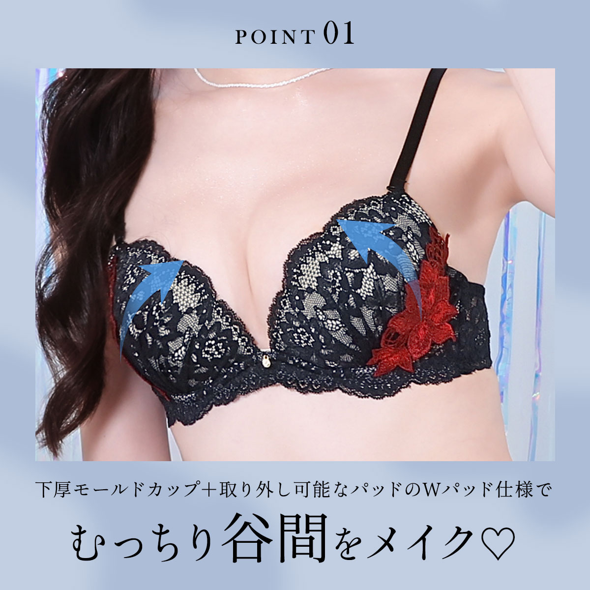 Wパッドでむっちり谷間♪ダリアのアップリケがリュクス感を演出する大人ブラセット☆