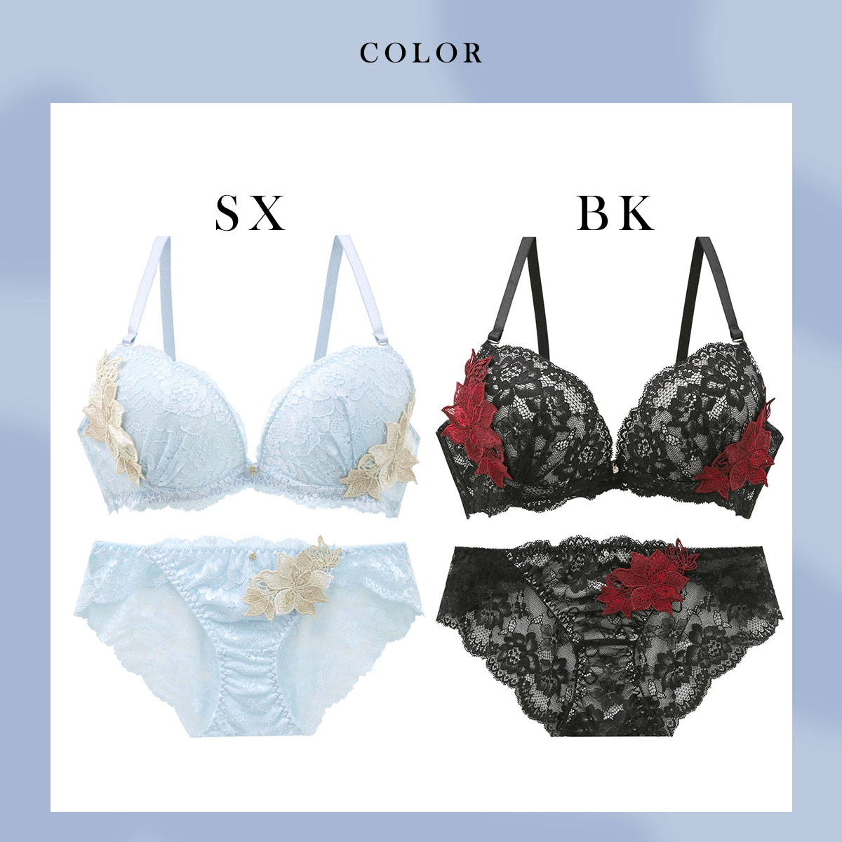 情熱的な真っ赤なダリアとのコントラストがセクシーなブラックと、アップリケとレースの繊細さを引き立てる上品なサックスの2色展開。ガラッと表情が変わるデザインは色違いで揃えるのもおススメです。