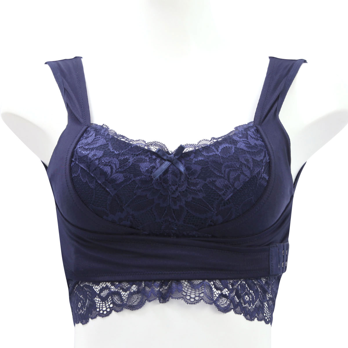 | 仕 様 | ・かぶりタイプ(フロントホックは2段3列) ・カップの深さ:普通 ・パッド取外し:可能 ・肩紐取外し、調節:不可 ・ワイヤーなし ・サイドボーン:なし ※生産時期によって生産国が異なる場合がございますが、お選びいただけません。予めご了承下さい。 |