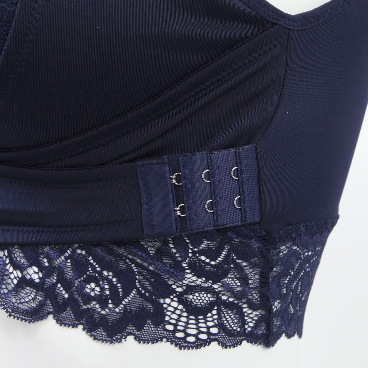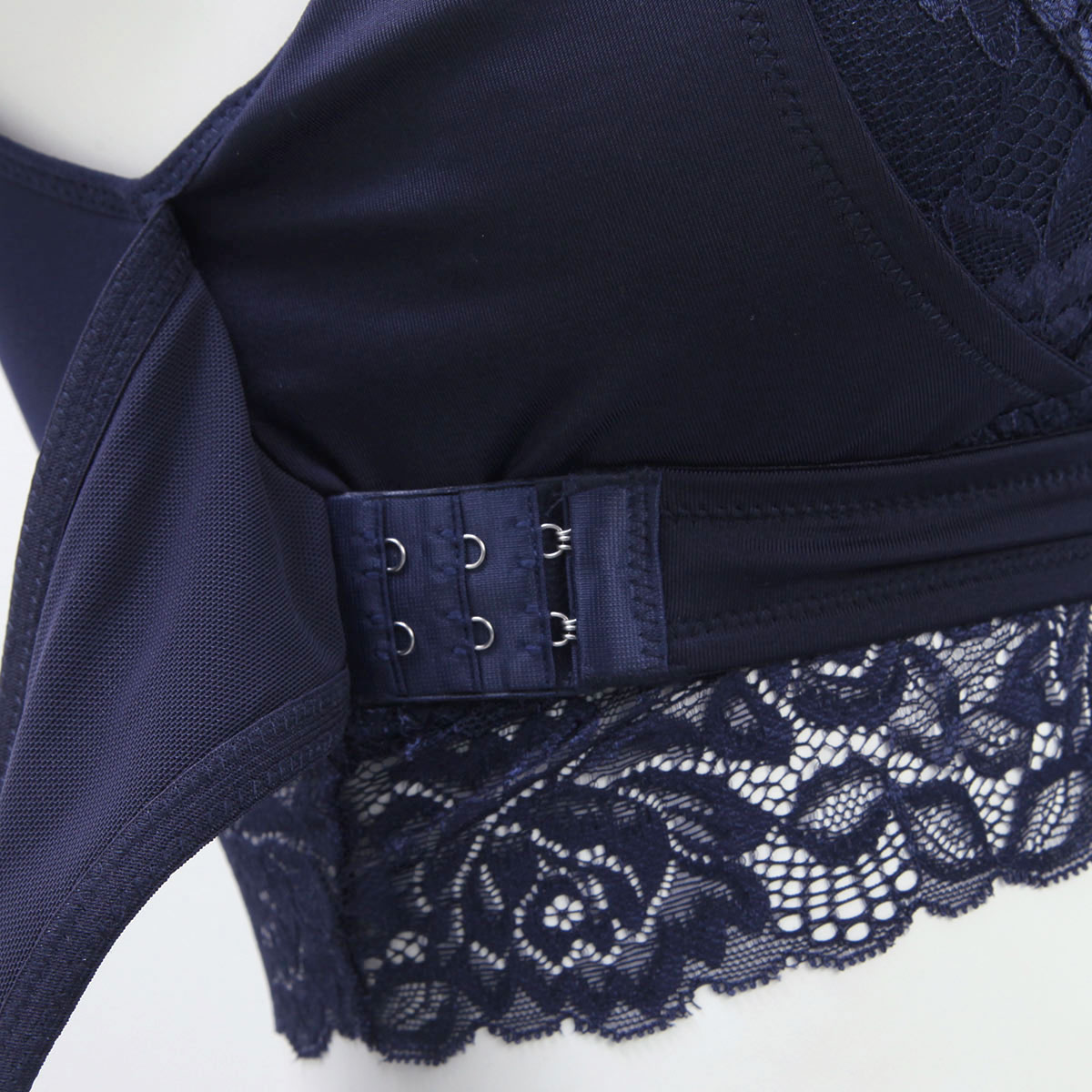 クロスベルト効果で、バストを下からささえ寄せあげます。脇高仕様で、バストの横流れと下垂予防。さらにフロントホックでフィット感UP!タテ・ヨコの面からサポートます。