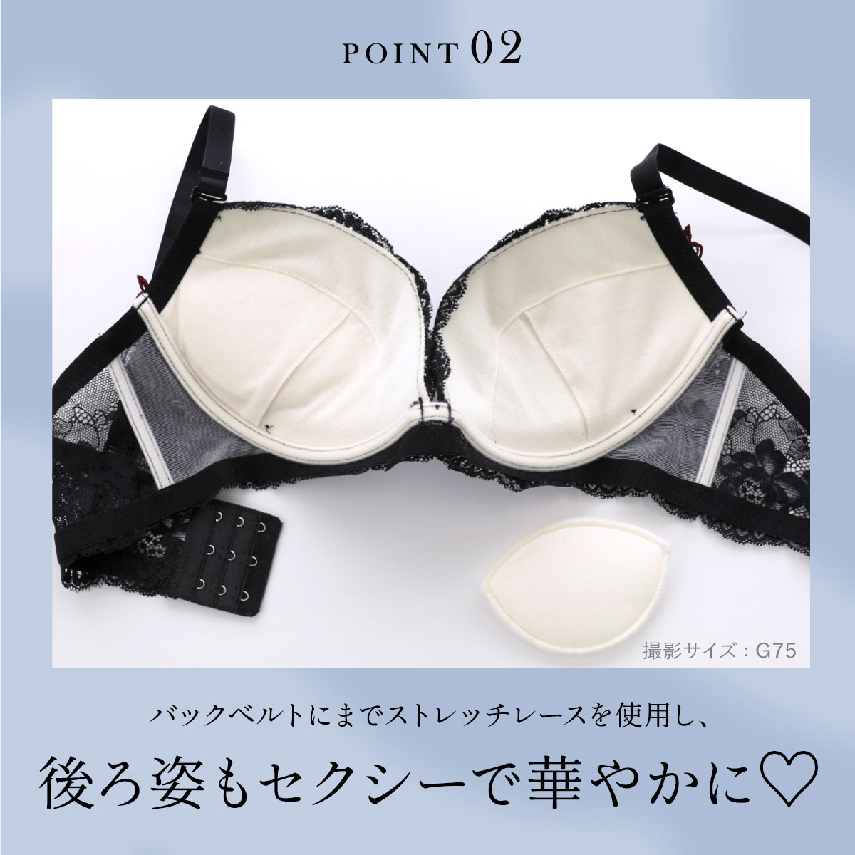 カップ脇は伸び止めの裏打ちとサイドボーン入りで、着装時の安定感をアップ。バックベルトにまでストレッチレースを使用し、後ろ姿もセクシーで華やかに☆