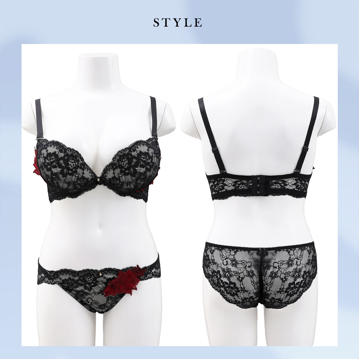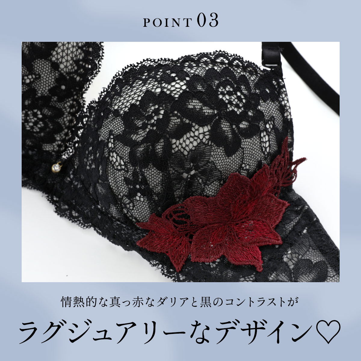 情熱的な真っ赤なダリアとのコントラストがセクシーなブラックと、アップリケとレースの繊細さを引き立てる上品なサックスの2色展開。ガラッと表情が変わるデザインは色違いで揃えるのもおススメです。