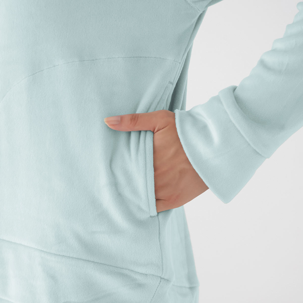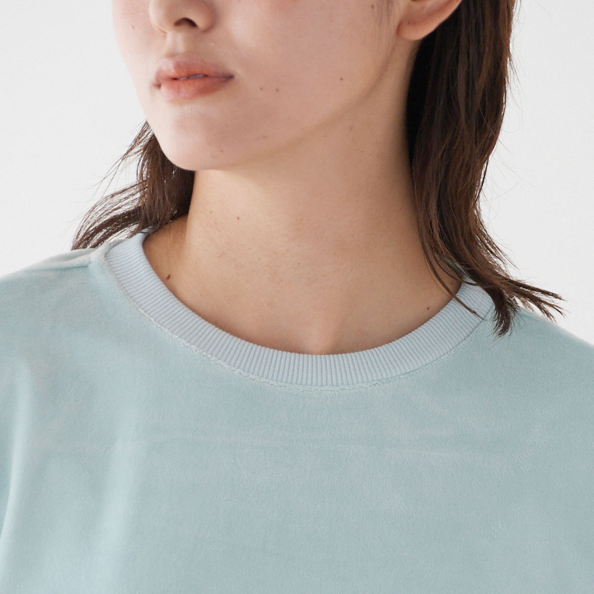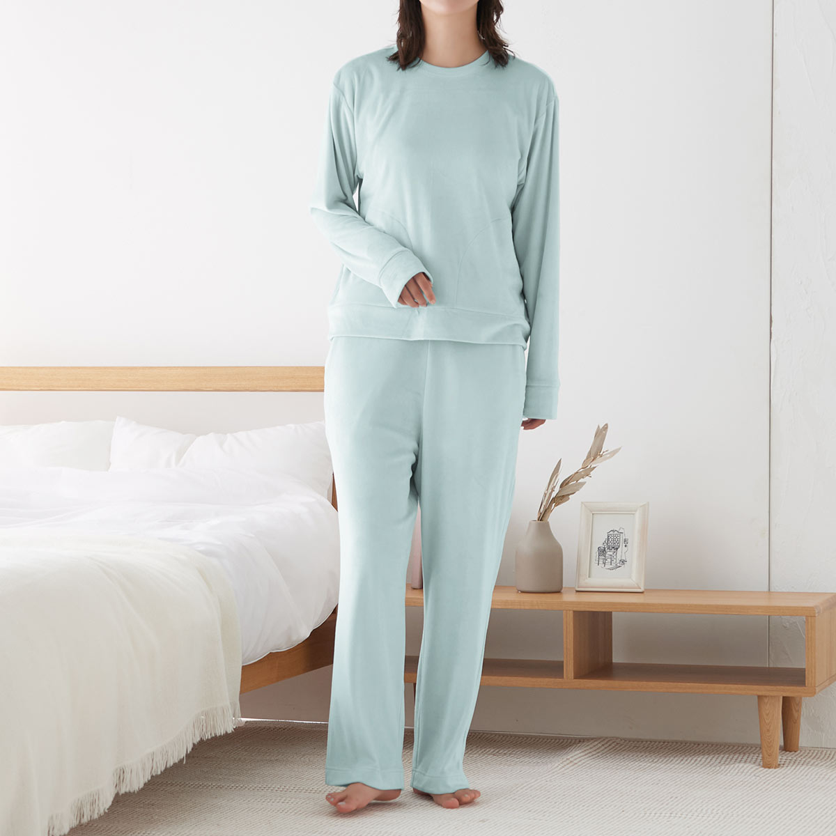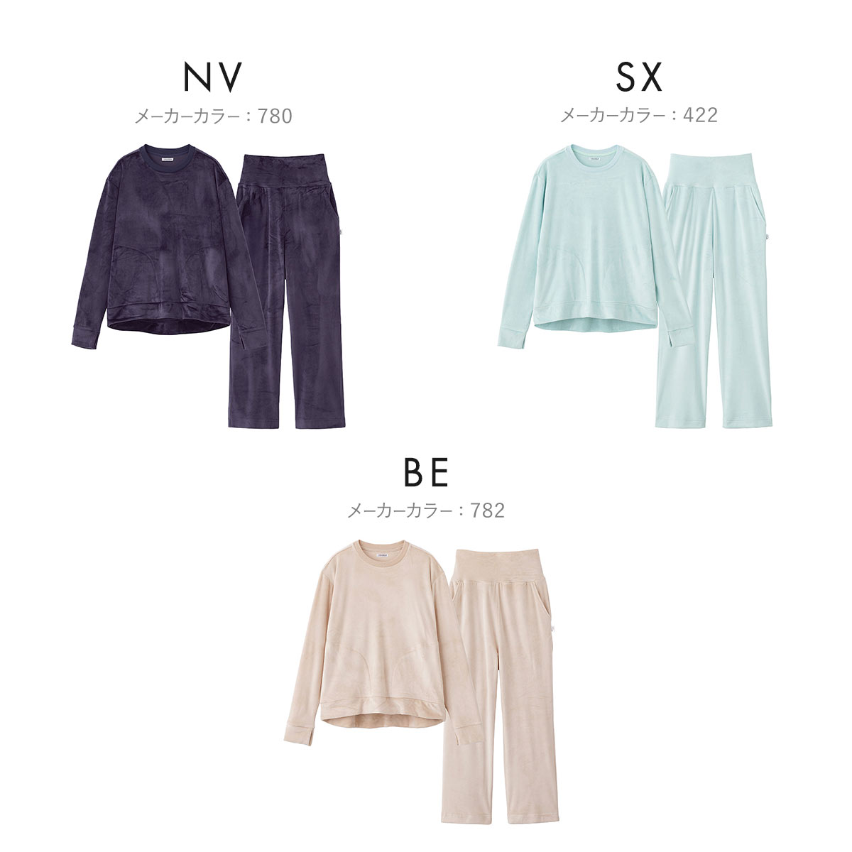 なめらかな光沢が美しいベロア素材は、見た目も着心地もリッチな雰囲気。とろけるような肌触りで、おうち時間を贅沢な気分にさせてくれます。締め付け感のないゆったりとしたシルエットで、ストレスなくリラックスできます。トップスはドロップショルダーで肩周りの動きが楽ちん。シンプルなデザインなので、急な来客時にも慌てず対応できます。自分へのご褒美や、大切な方へのプレゼントにもおすすめです。