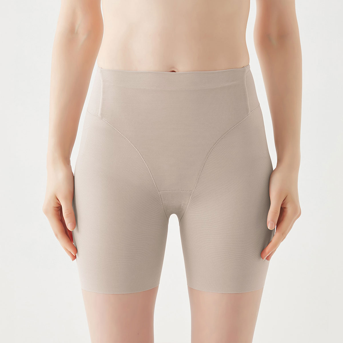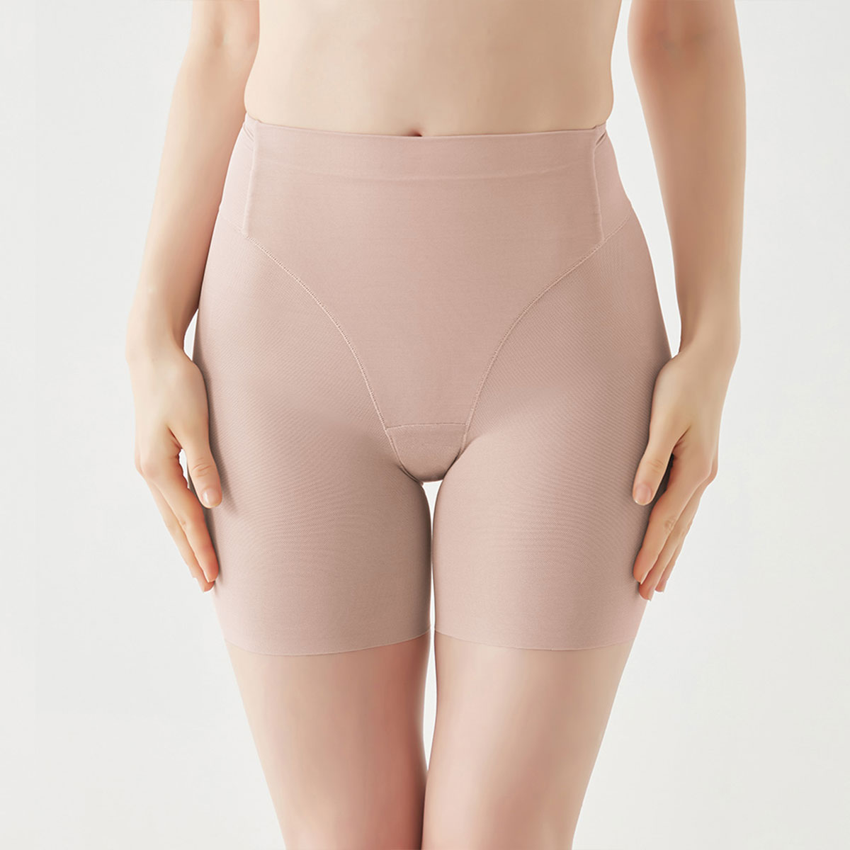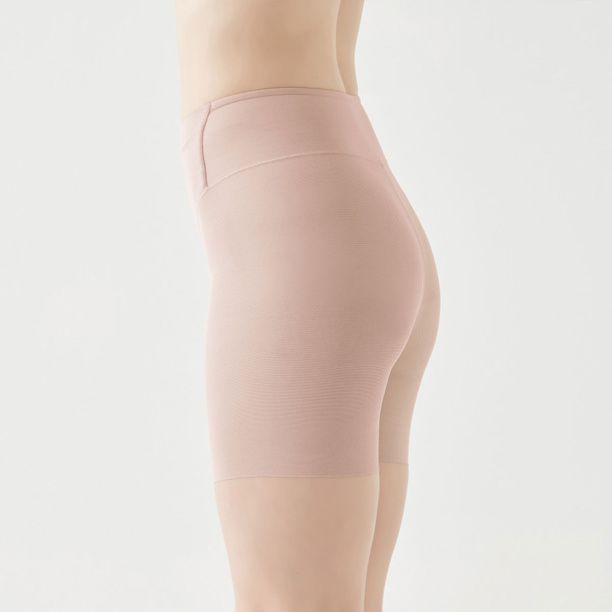 キュッとお腹+太ももシェイプで気になる部分をトータルサポートの2分丈ショーツ。裾カットオフ仕様で、アウターにもひびきにくい設計に。伸縮性に優れたパワーネット素使用しているので、締めつけすぎず快適にご着用いただけます。