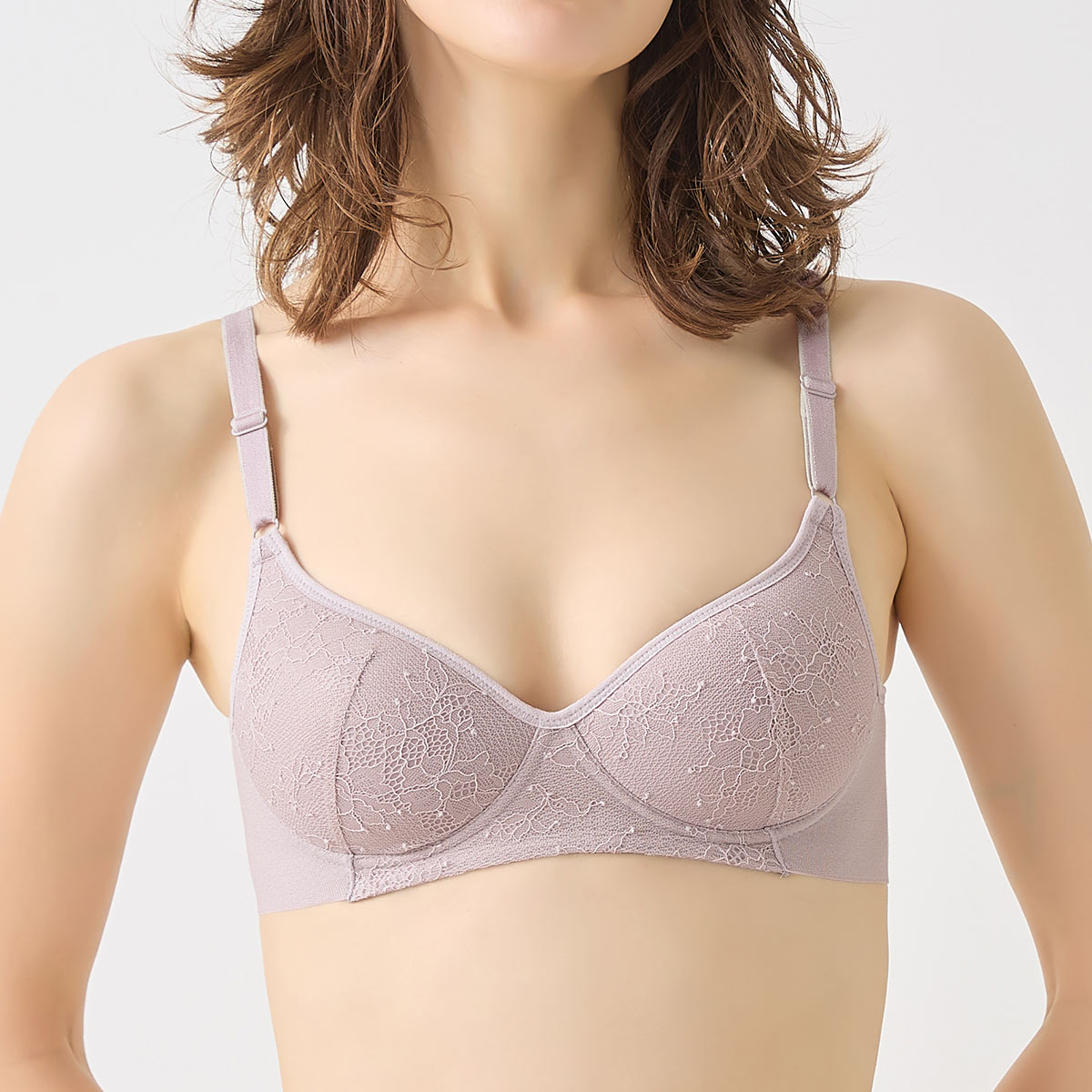 お肌に触れる面をすべて綿100%で仕上げたオーガニックコットン混素材を採用し、デリケートな肌を優しくいたわりながら、天然素材ならではの安心感と快適さを提供します。アンダーゴムをなくした設計で締め付けを軽減しつつ、内蔵されたモールドカップがバストを優しく包み込んで美しい形を整える、肌へのいたわりと理想的なバストシルエットを両立したノンワイヤーブラジャーです。