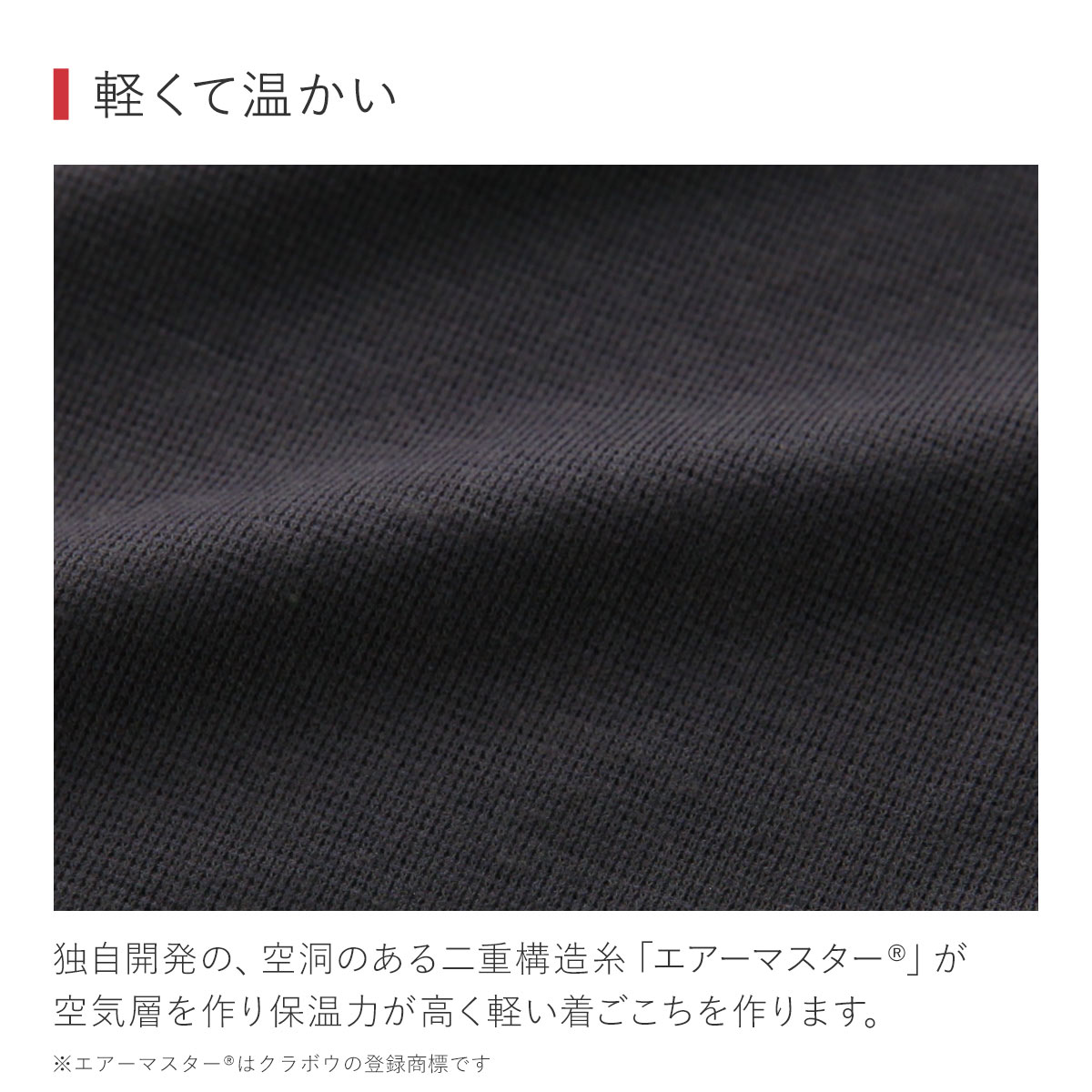 新開発の二層構造糸「エアーマスター※1」を使用。今までにない軽さと保温性、ぬくもりを実現しました。※1.エアマスターはクラボウの商標登録です。