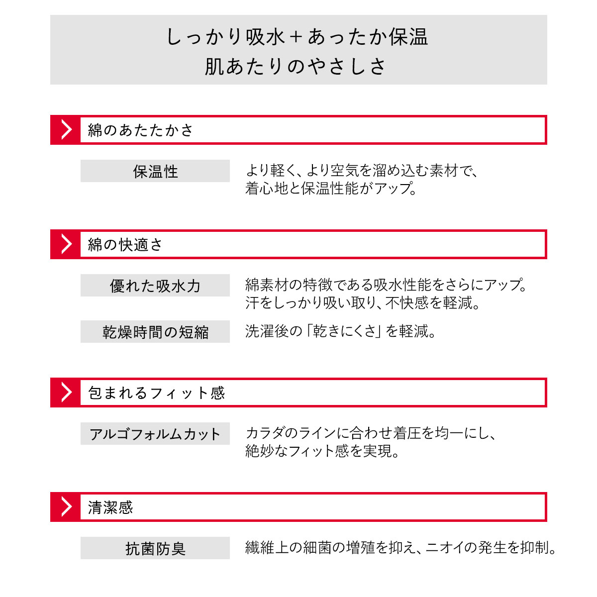一般的な機能性インナーよりも保温性が約1.3倍向上し、実感できるぬくもりに。綿素材の特徴を活かし、従来品よりも吸水性能が約2倍アップし、汗をよく吸収。快適な着心地で、「洗濯後の乾きにくさ」も軽減された、日常的に使いやすいインナーです。