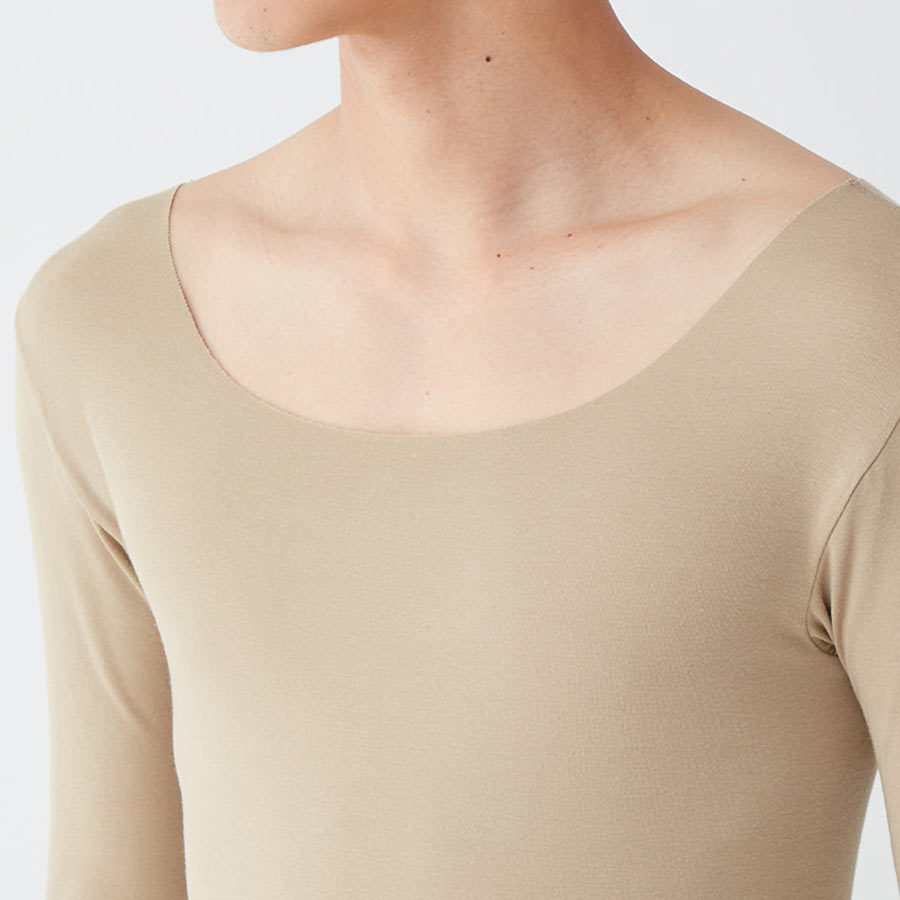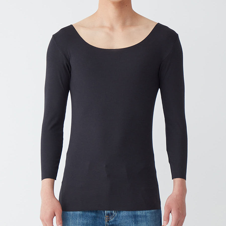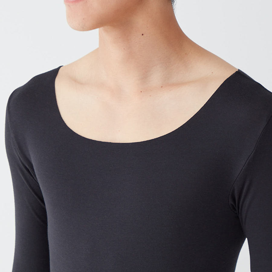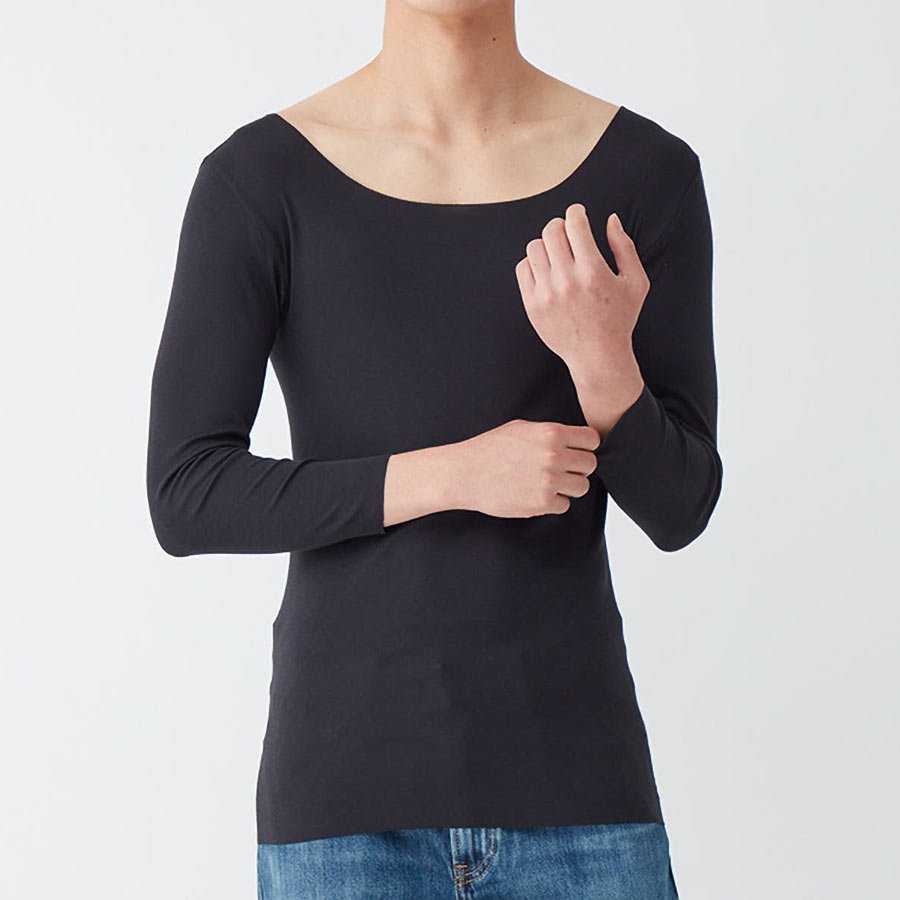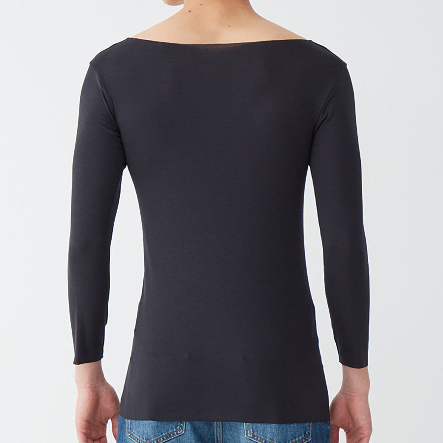 ・ボートネックにも対応できるように改良。ネックスタイルのラインを広めにすることでインナーのはみ出しを抑えます。