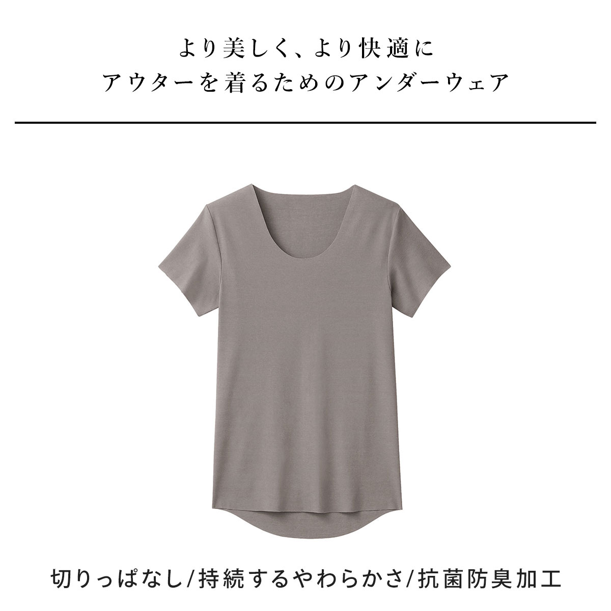 襟、脇、裾はカットオフ技術を採用したきりっぱなし仕上げ。インナーのラインがひびきにくく、タグが無いので縫い目の違和感が少ないストレスフリーなフィット感。