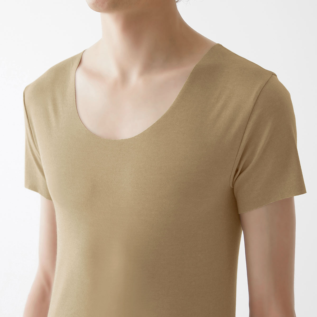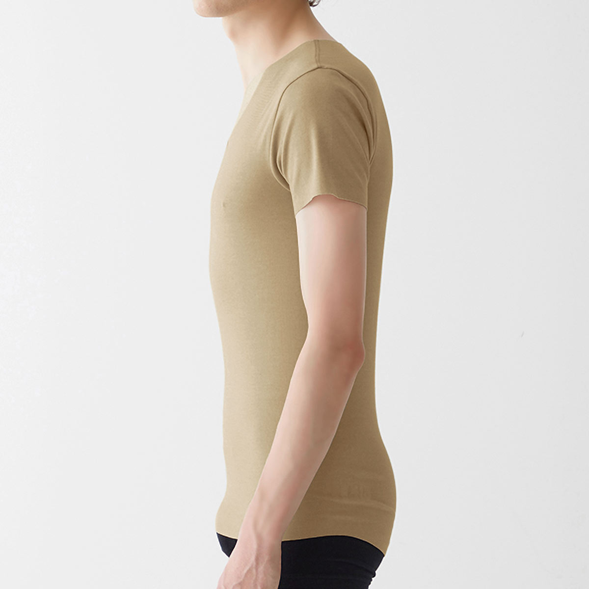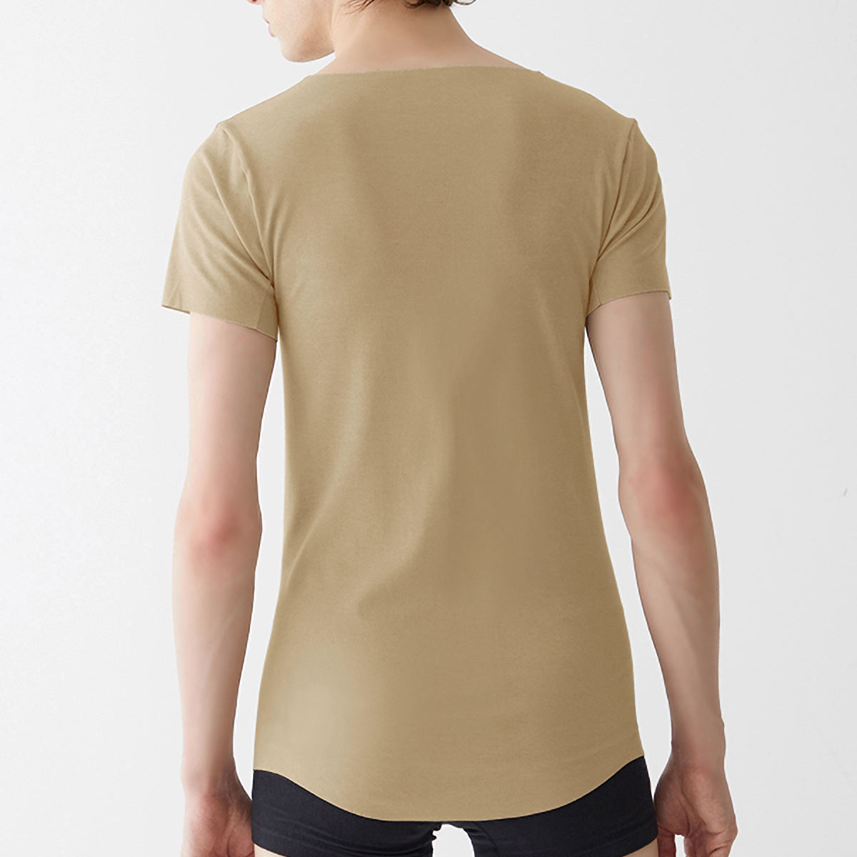 ドレスシャツやポロシャツの襟元からインナーが覗きにくいネックラインと、かがんでも背中が見えにくい後ろ丈長めの立体前後差設計。