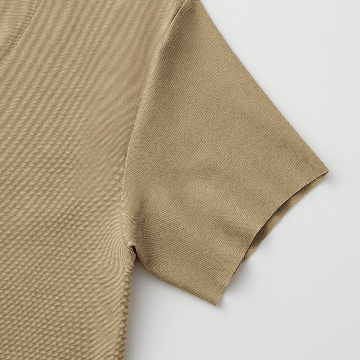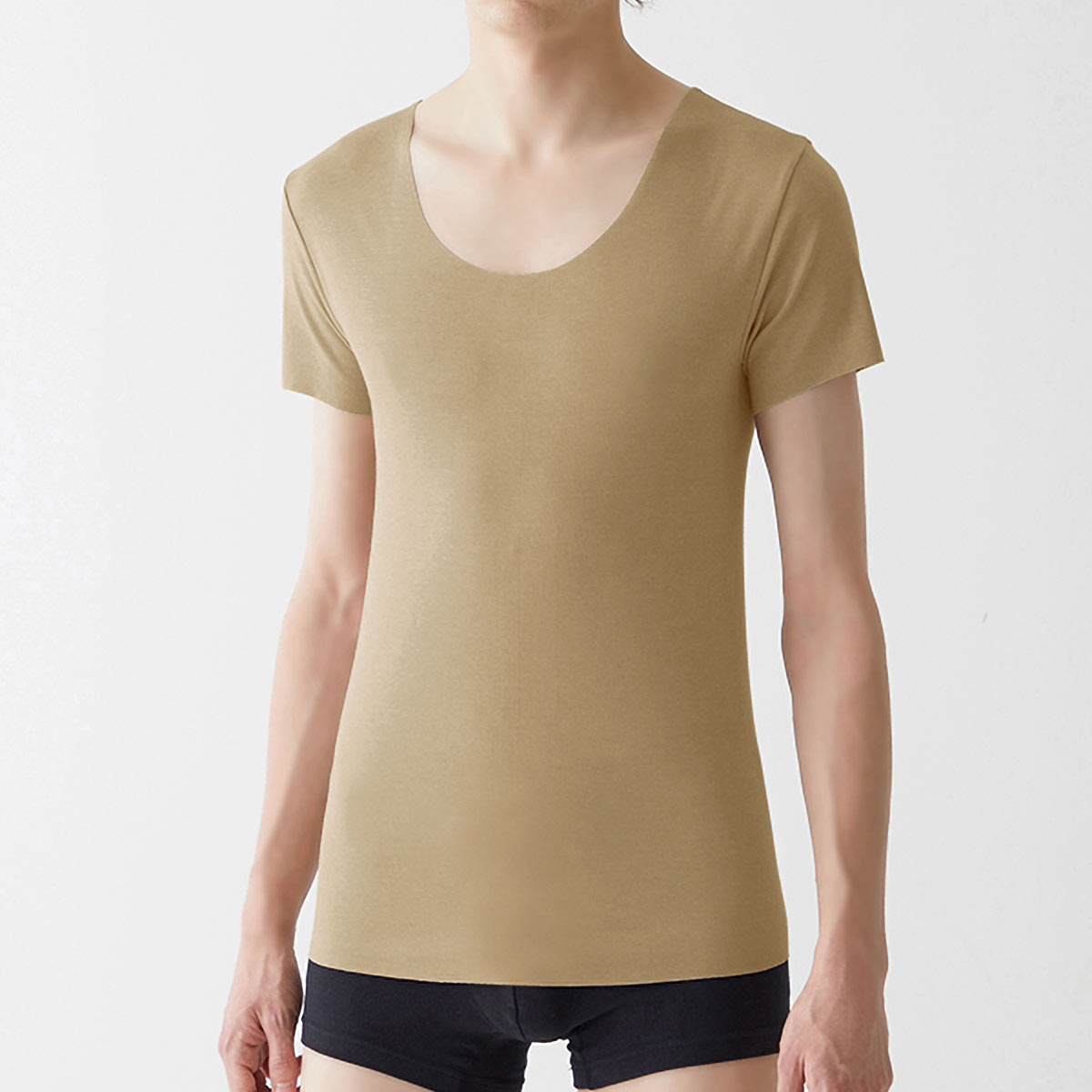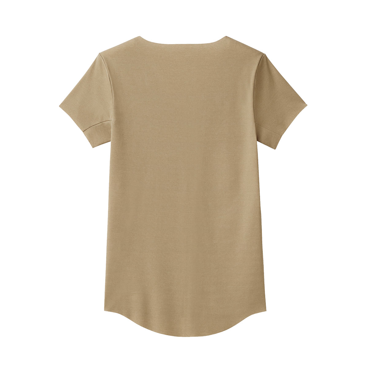 ドレスシャツやポロシャツの襟元からインナーが覗きにくいネックラインと、かがんでも背中が見えにくい後ろ丈長めの立体前後差設計。