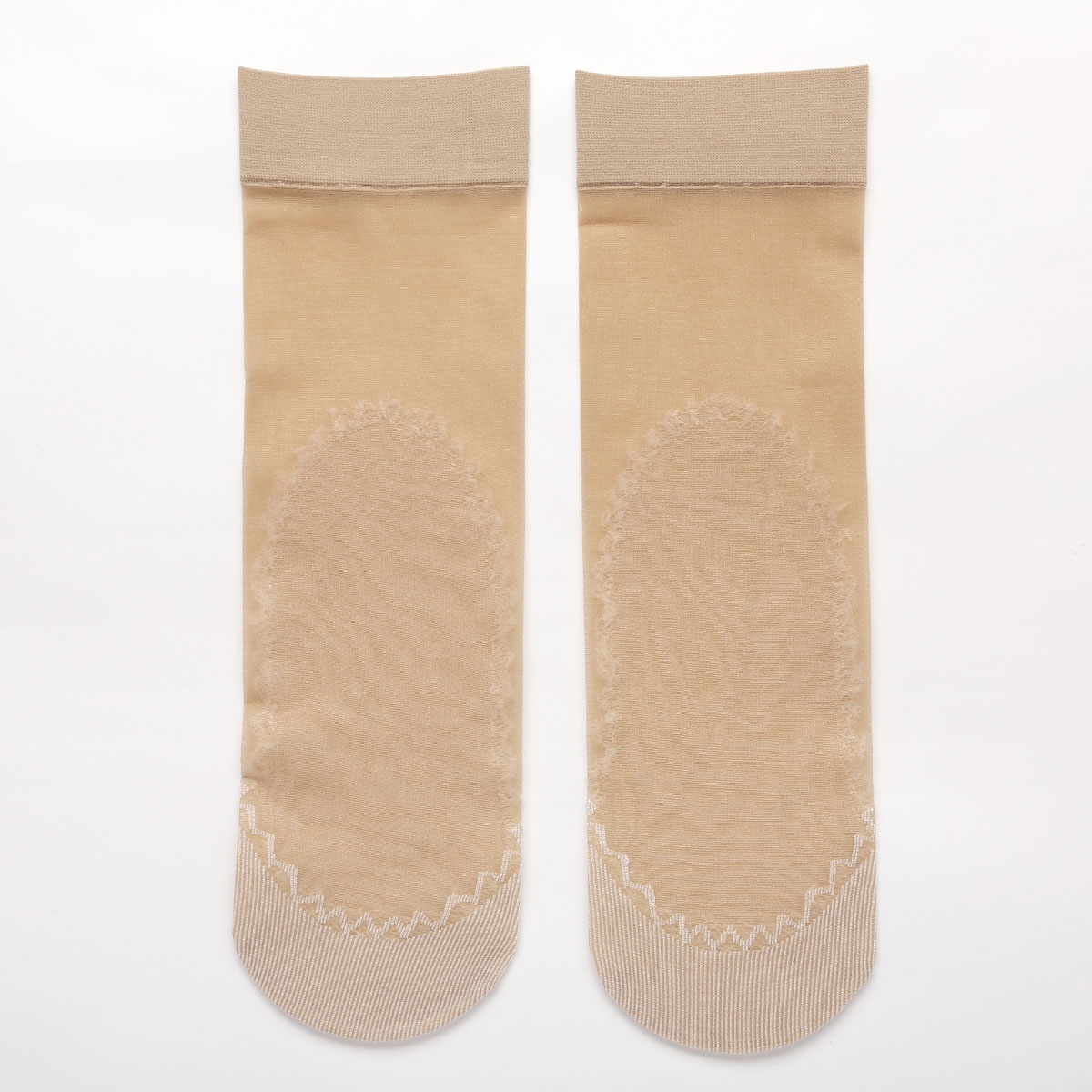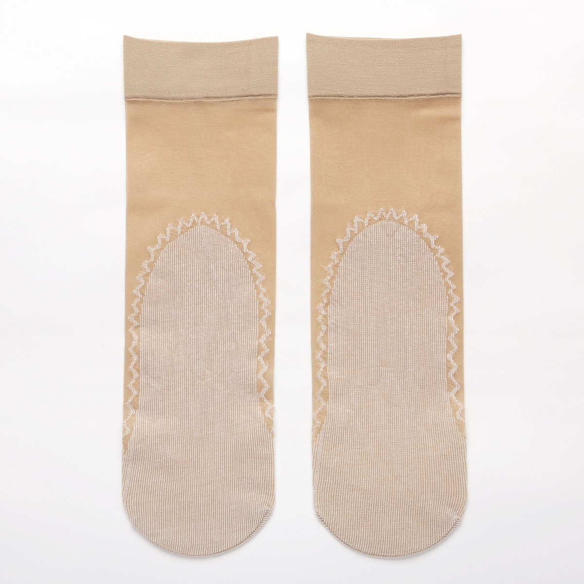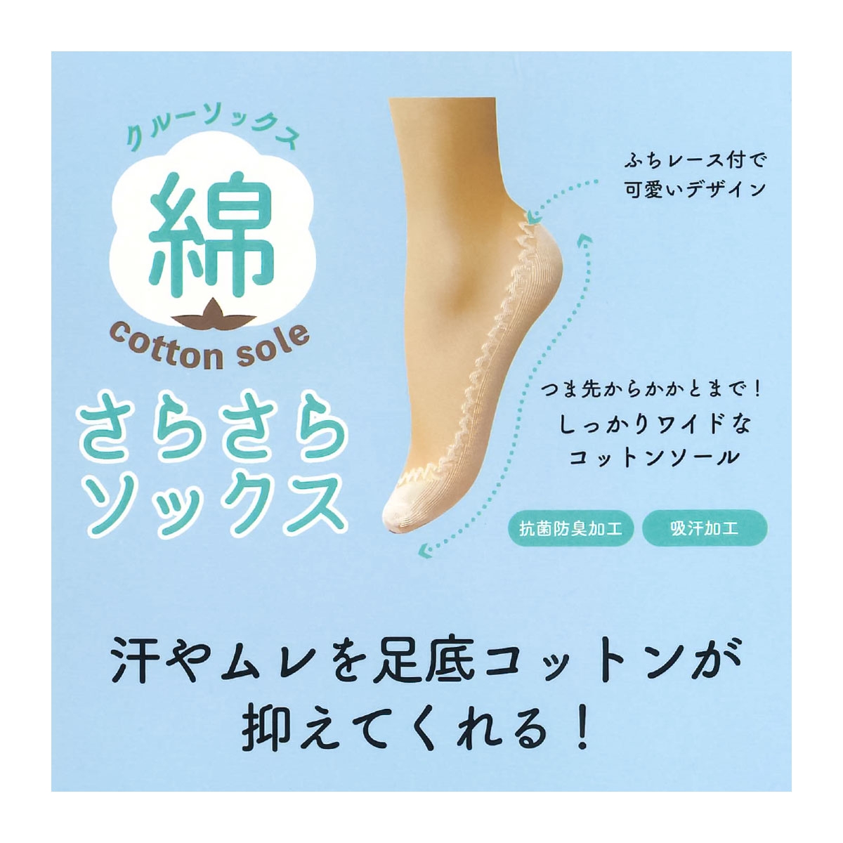 甲とレッグ部はストッキング生地、つま先からかかとまではワイドなコットンソール仕様で汗やムレをおさえてさらっと快適な履き心地です。ソール部分はふちレースで見えても可愛いデザインになっています。