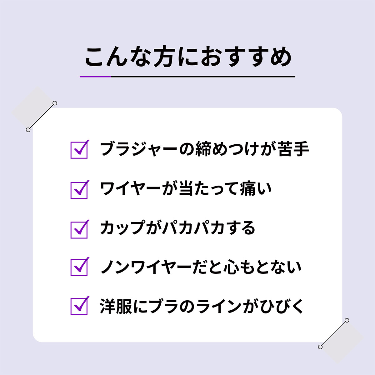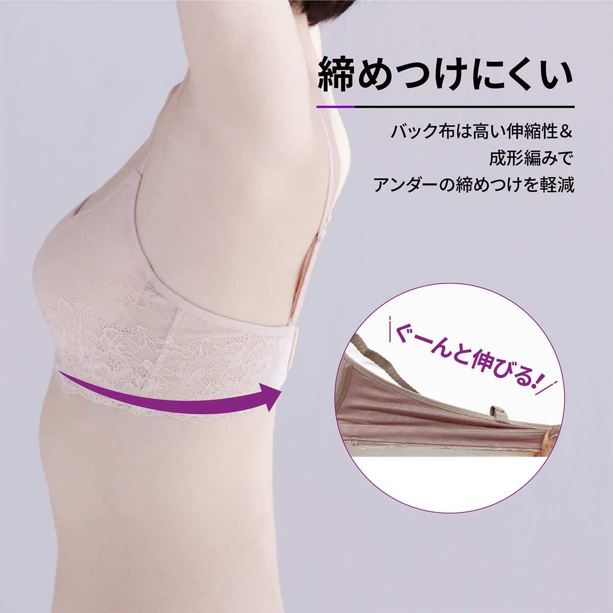 グーンとよく伸びる高伸度の柔らかい成型編み素材により、アンダーバストの締めつけを軽減して、体に優しくフィットし、痛くなりにくい柔らかなワイヤーにより、窮屈さから解放!丸く滑らかなモールドカップにより、美しく丸みのあるキレイなバストラインをメイクします。
