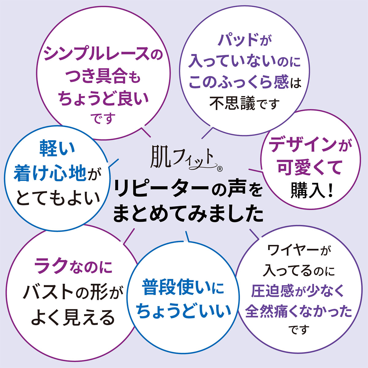 “気持ちいい毎日”がここにある。着用感にとことんこだわった「肌フィットブラ」は、体に優しくフィットして、バストラインをキレイに整える、締めつけを軽減した楽ワイヤーブラです。