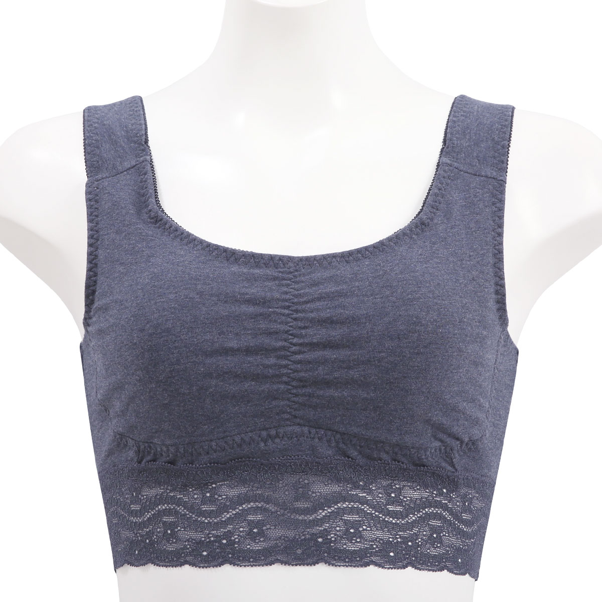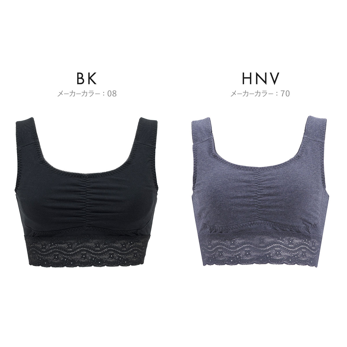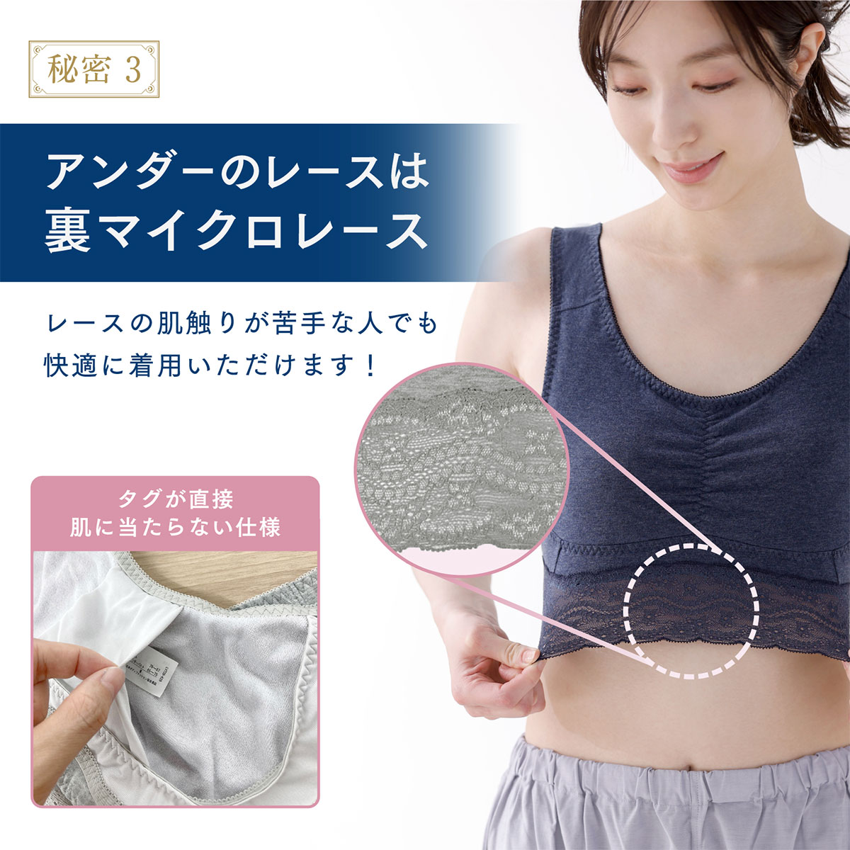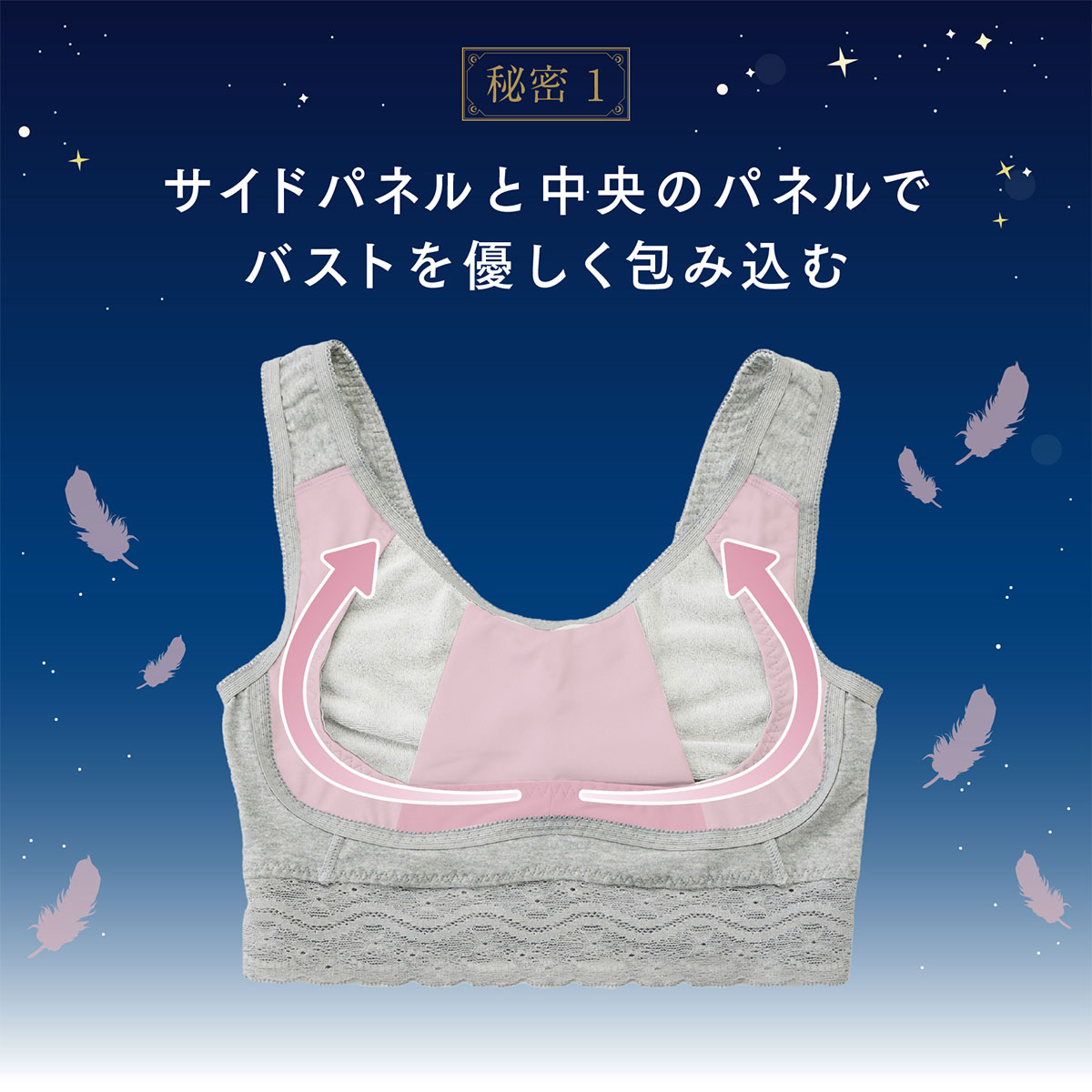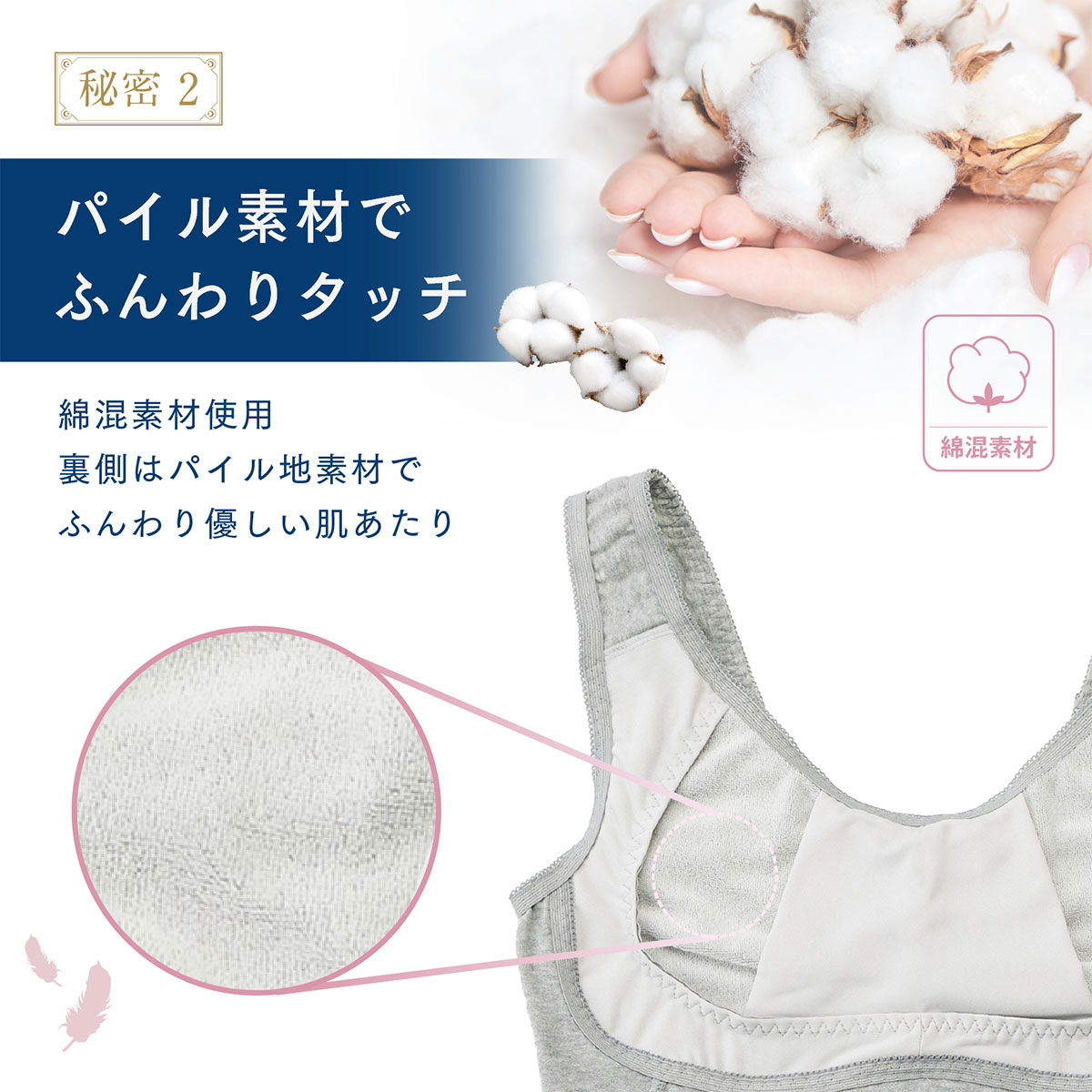 サイドと中央のパネルでバストを優しく包み込み、就寝中のバストをやさしくサポートします。身生地は綿混素材で、肌側にはパイル素材を使用。やわらかな肌あたりです。アンダーのレースも、裏マイクロ素材のレースを使用しているので、なめらかでチクチクしずらい仕様に。レースの肌触りが苦手な方でも快適にご着用いただけます。